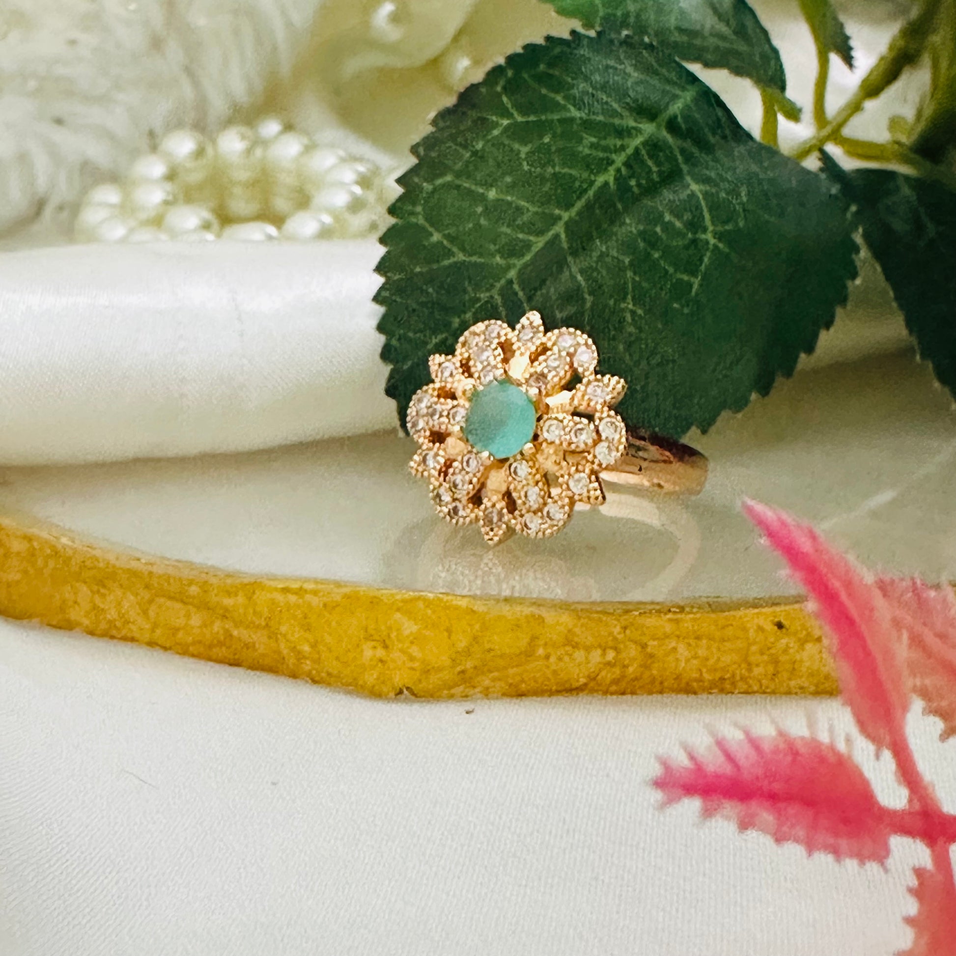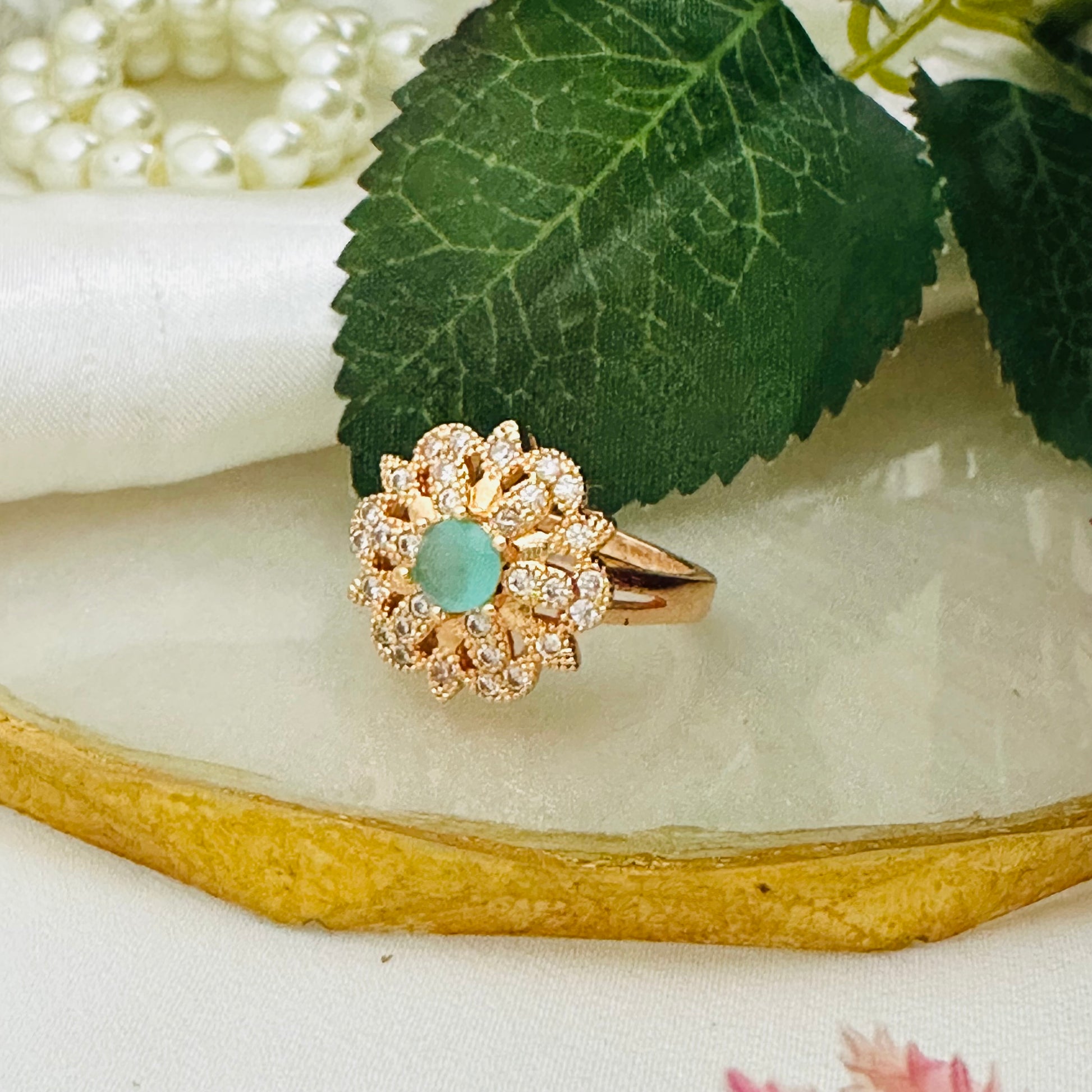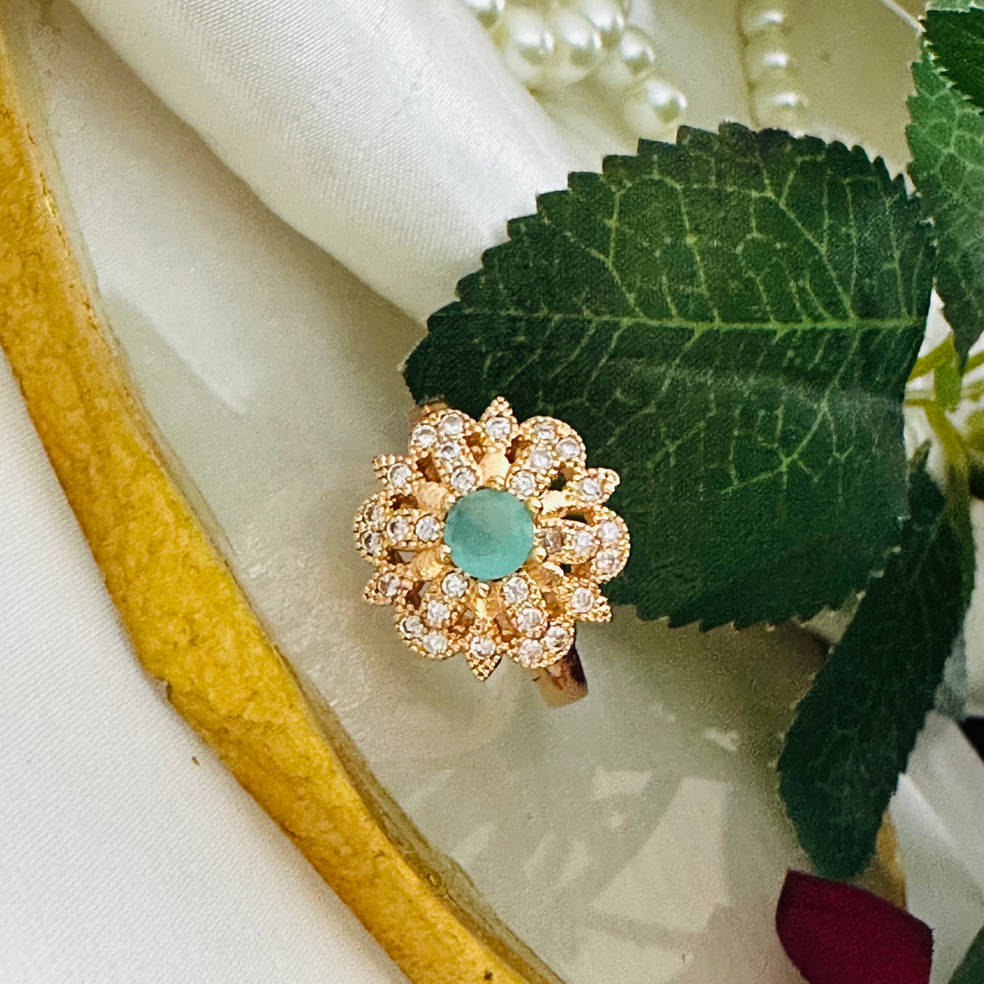 This Zinnia Glow ~ Aqua ring features an adjustable delicate design, highlighted by a sparkling aqua stone and intricate zircon flower detailing. Elevate your style with this elegant and versatile piece.