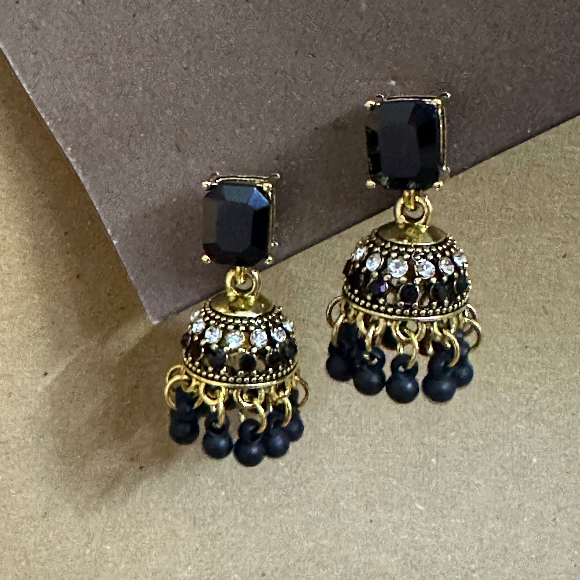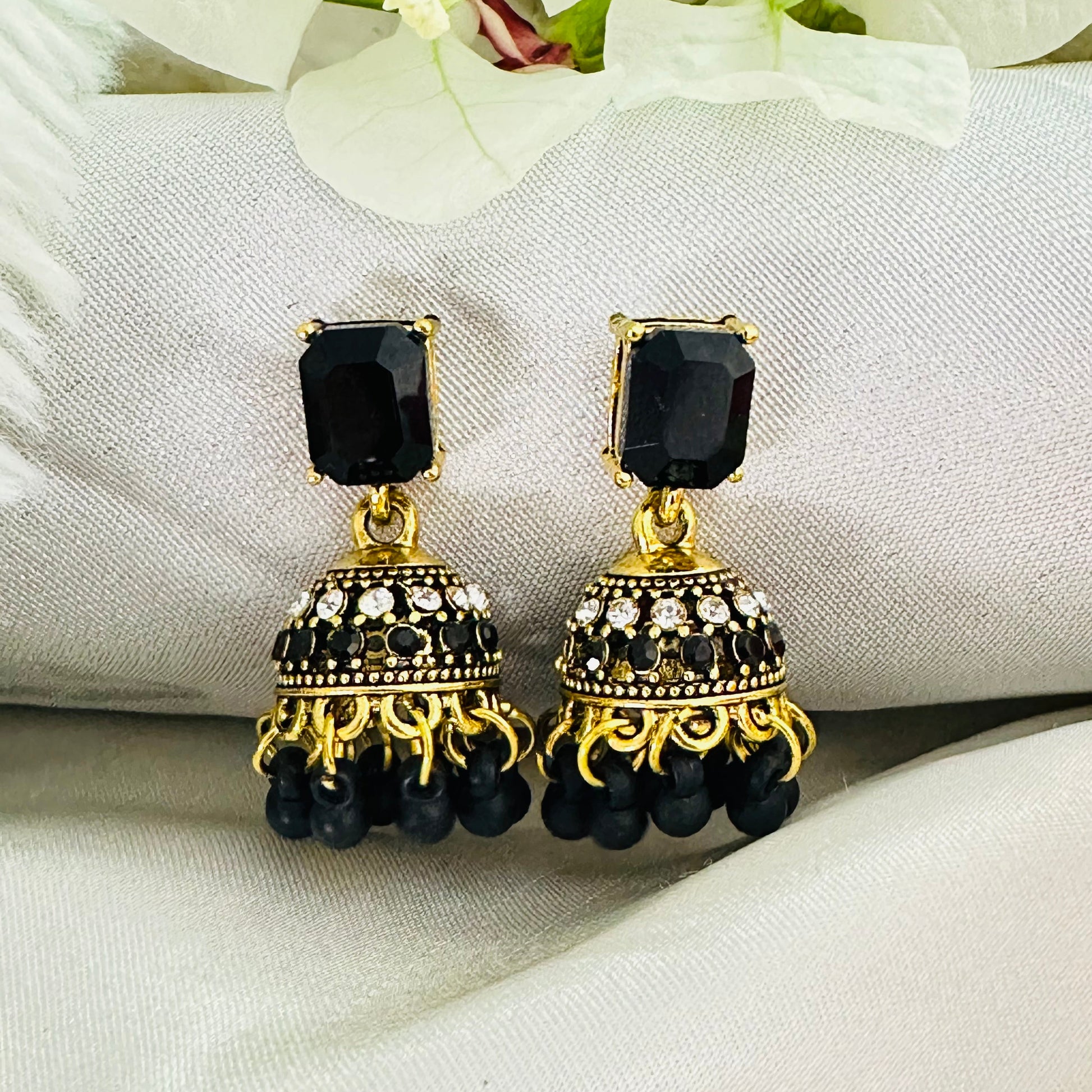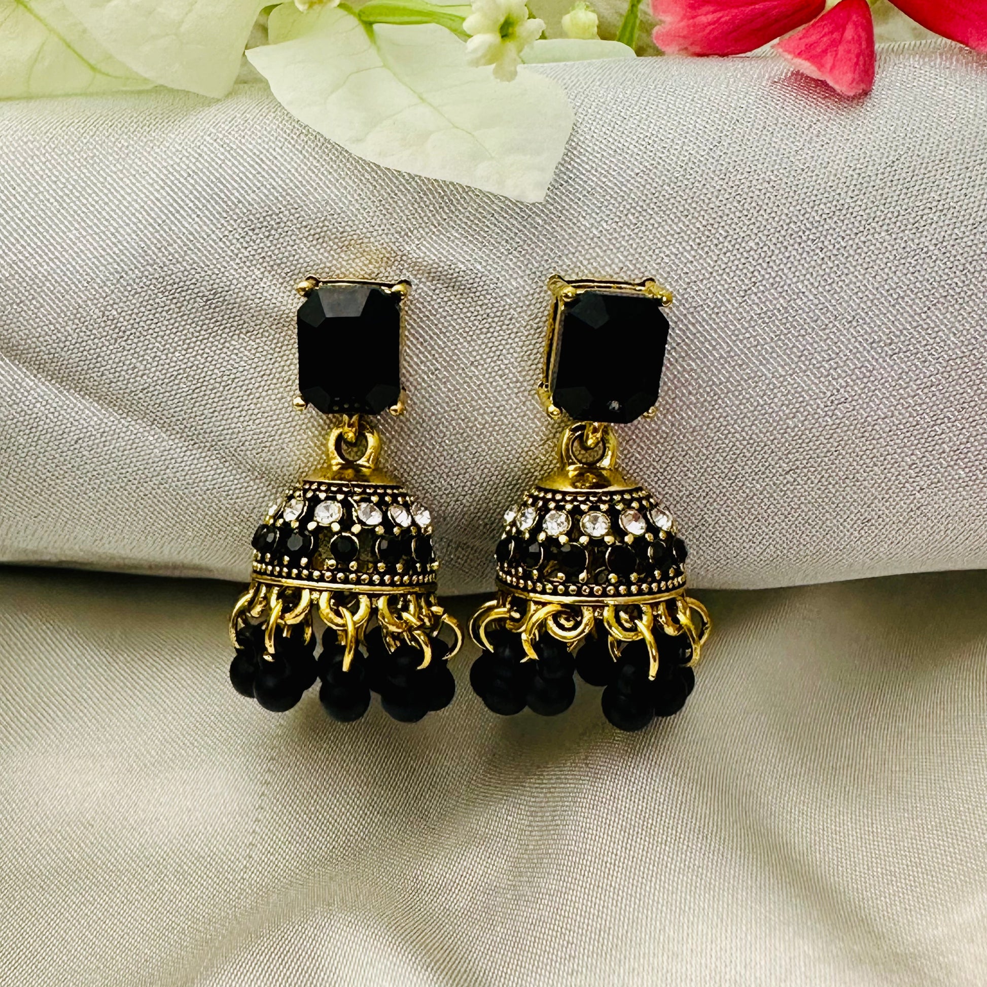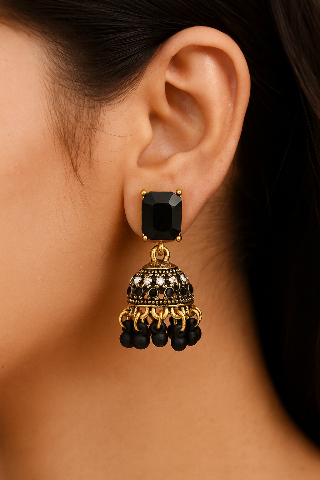 Add a bold touch to your look with these black jhumkas! Their elegant design combines timeless charm with a modern twist, perfect for dancing the night away or dazzling at any event. Lightweight and comfortable, these earrings let you shine effortlessly while turning heads wherever you go.
