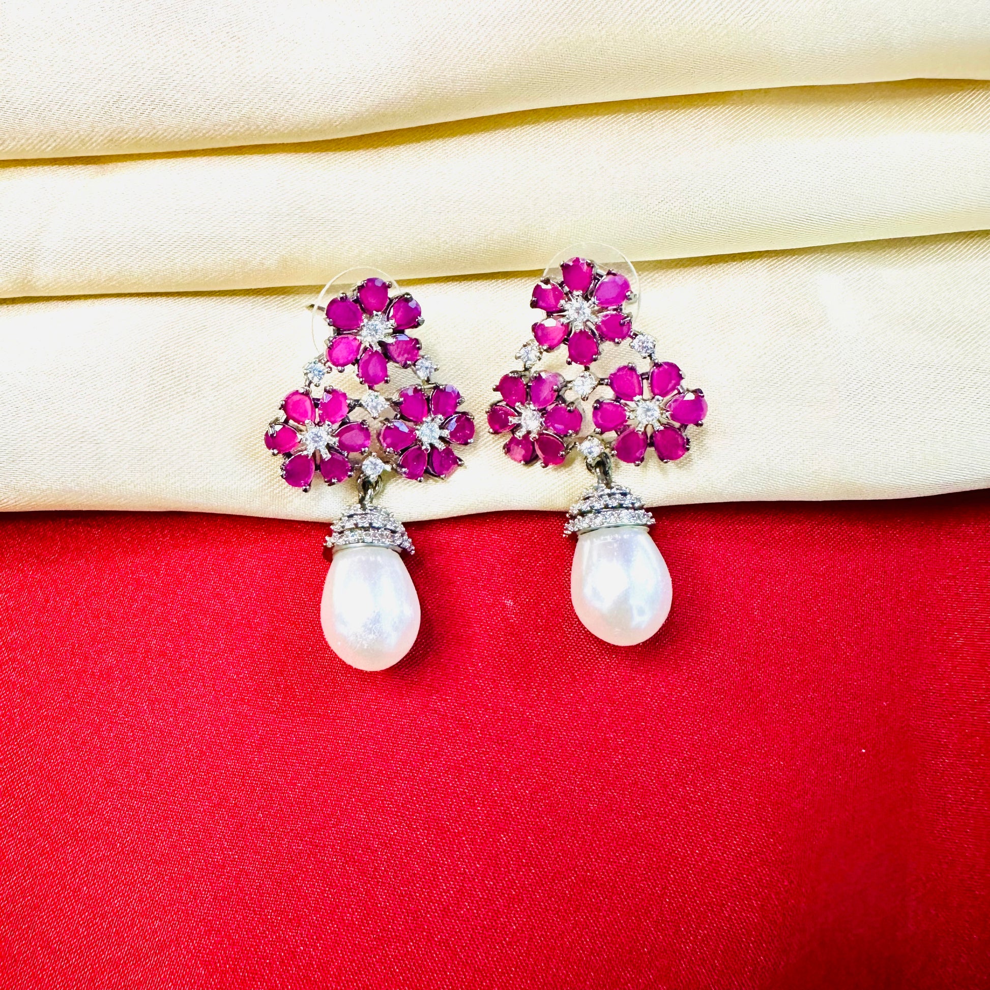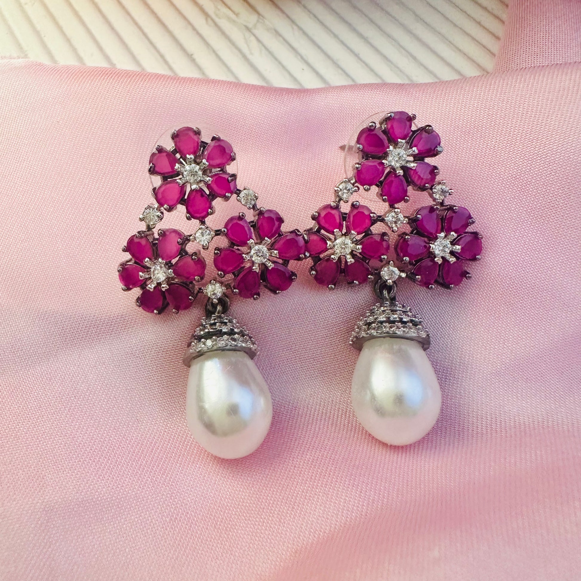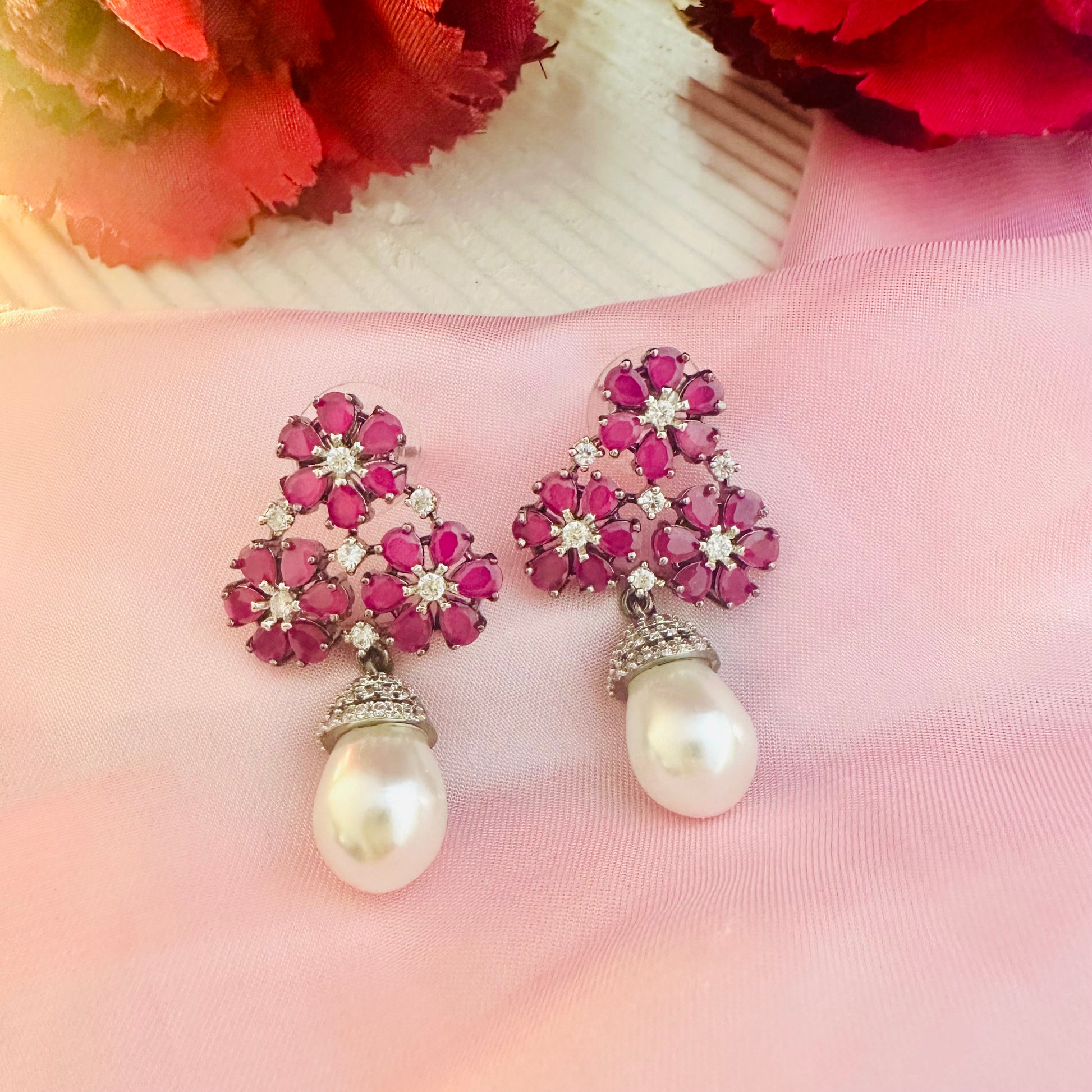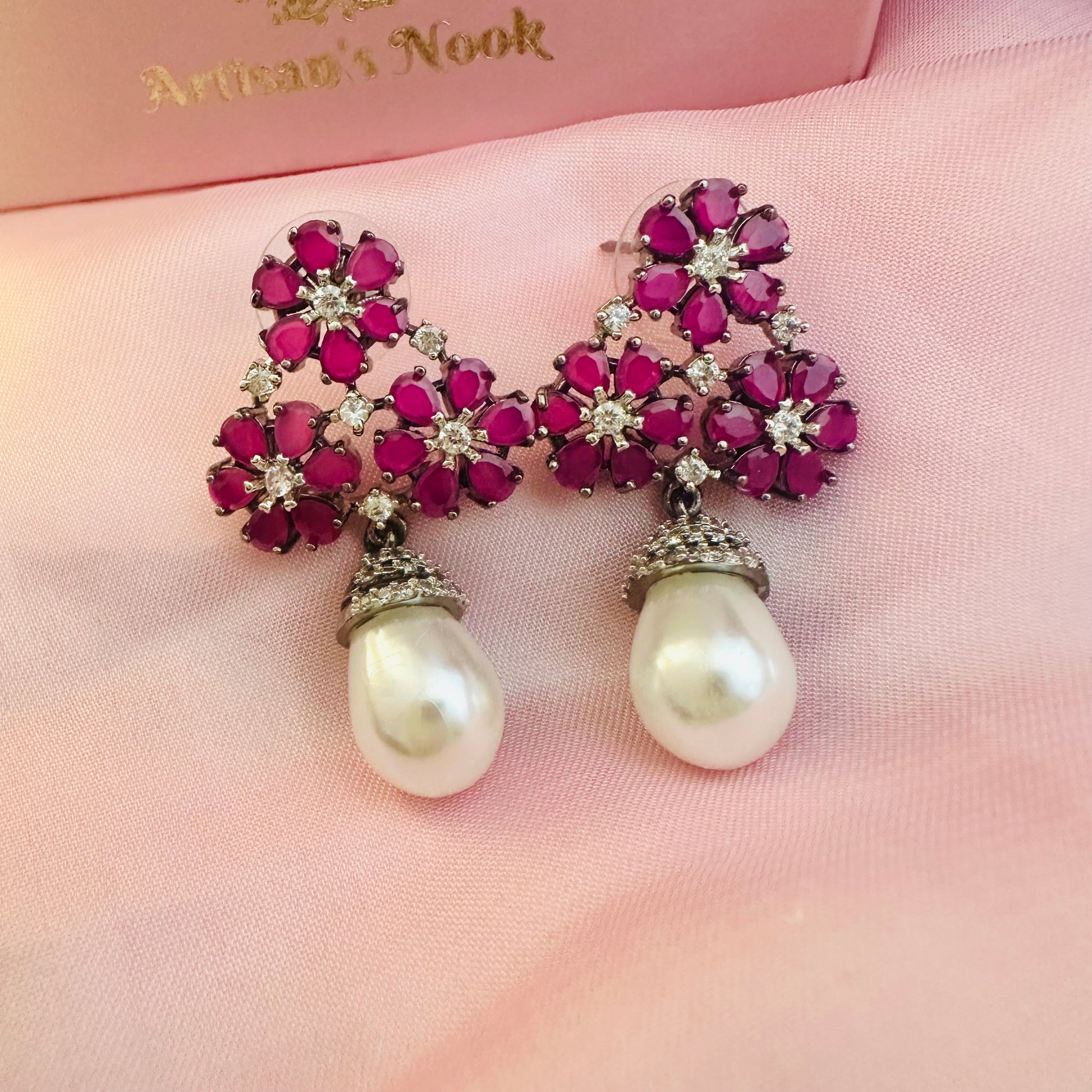 These elegant studs feature stunning ruby stones arranged in a delicate flower design, accented by a lustrous pearl drop. Perfect for adding a touch of sophistication to any outfit. Expertly crafted for a timeless and luxurious look.