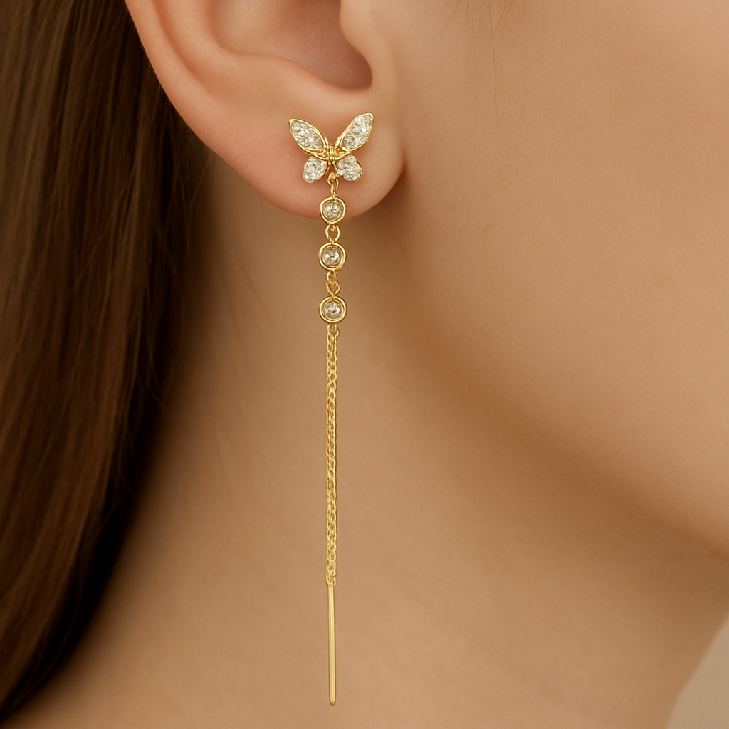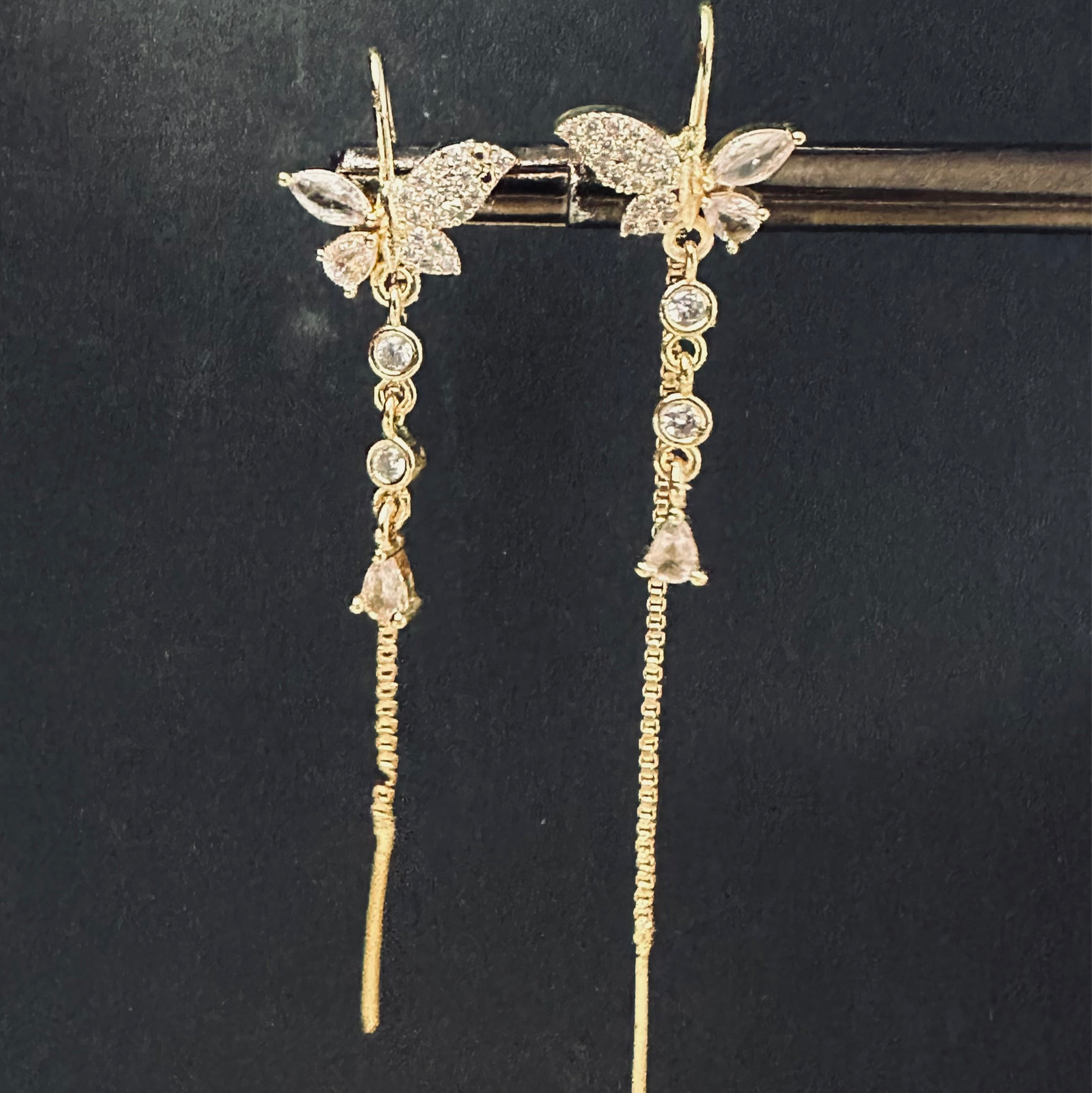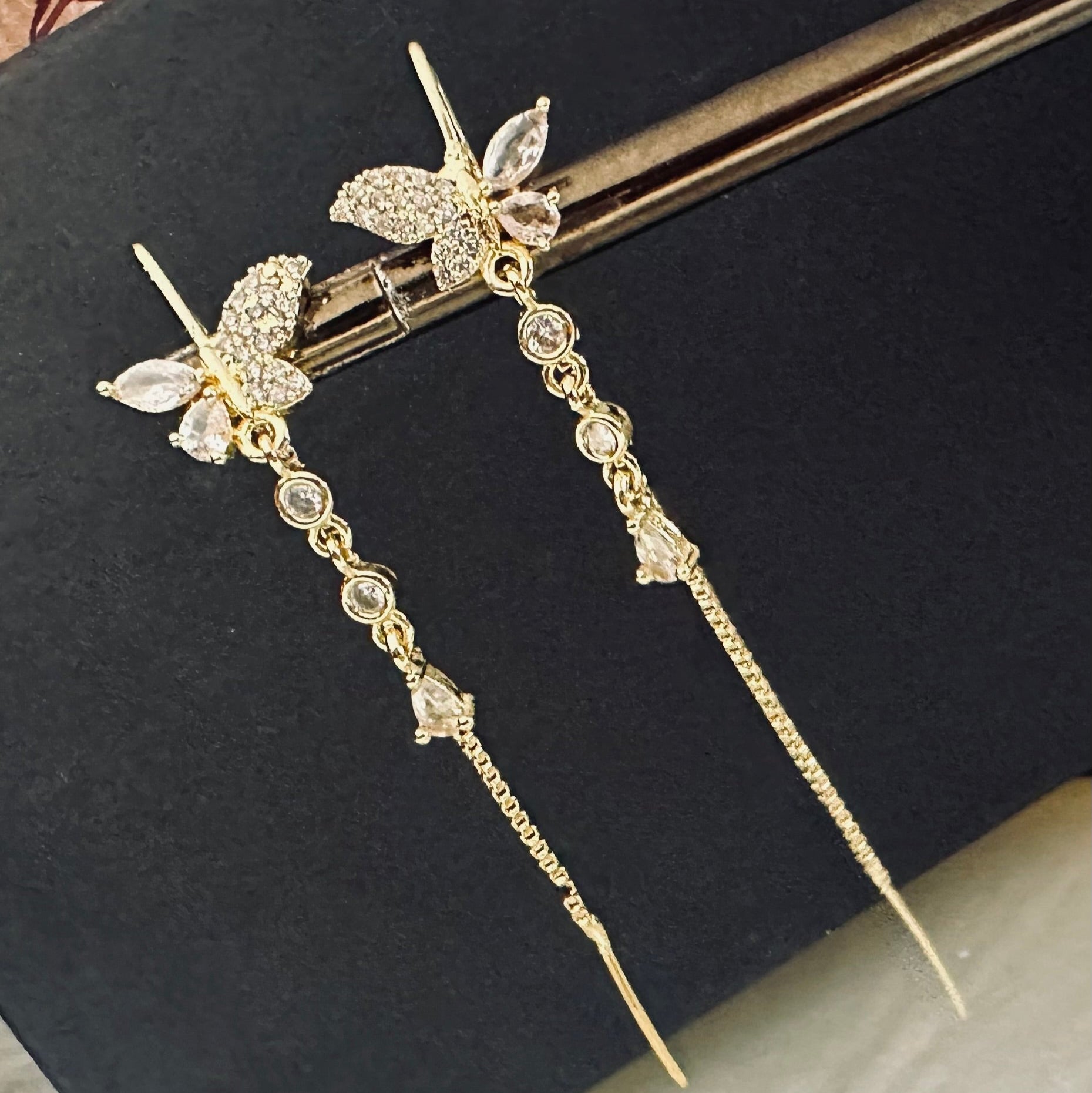 These expertly crafted one-carat gold earrings showcase a unique dangle design featuring delicate butterflies paired with elegant hanging chains. The intricate detailing of the butterflies combined with the graceful movement of the chains creates a sophisticated accessory that complements both casual and formal styles. Perfect for those seeking a refined statement piece that blends artistry with timeless charm.