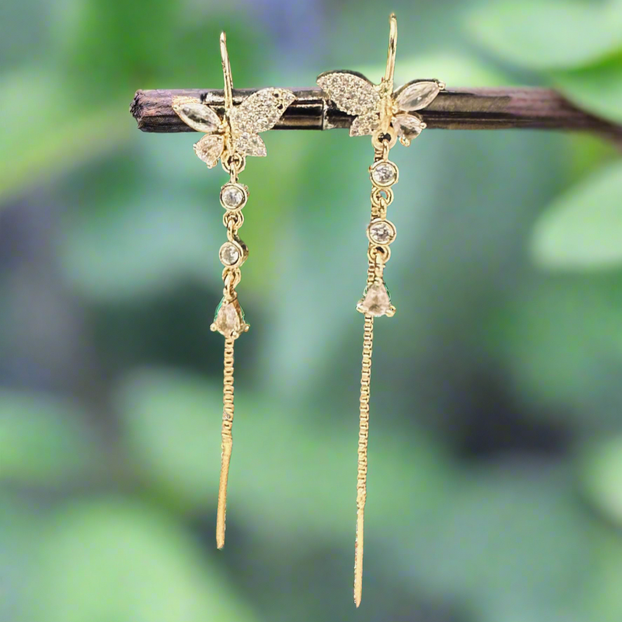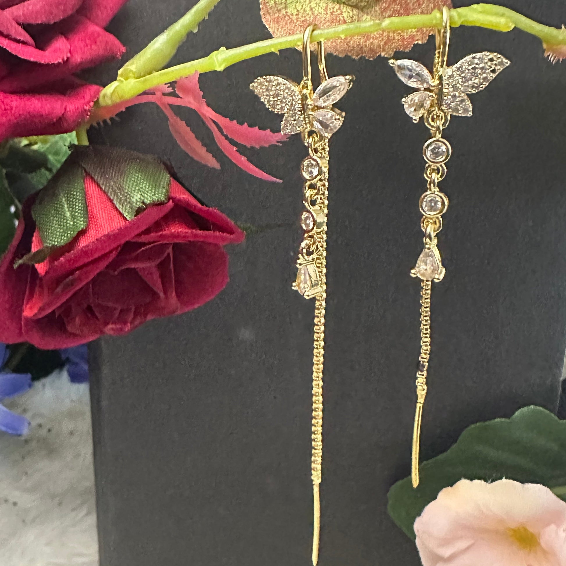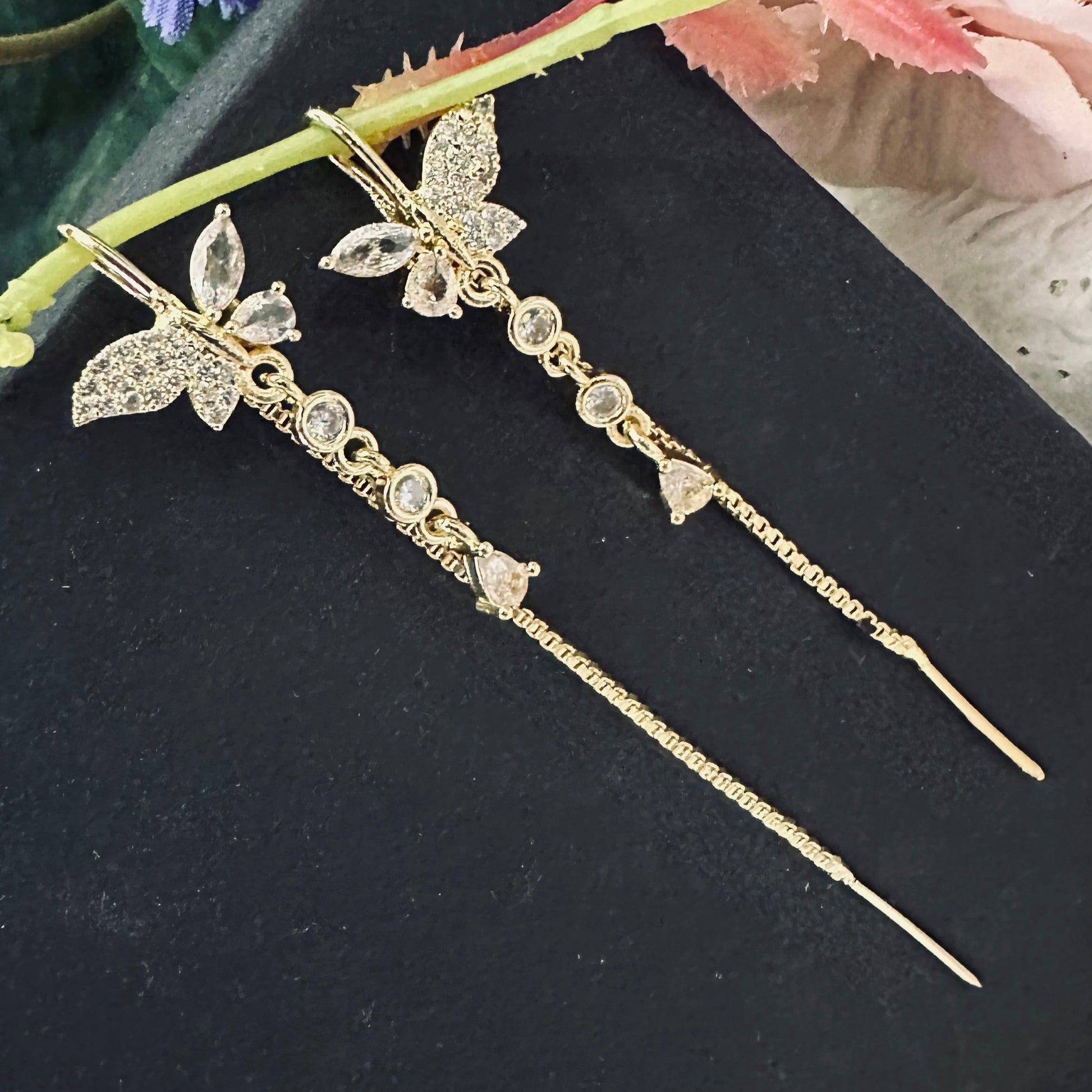 These expertly crafted one-carat gold earrings showcase a unique dangle design featuring delicate butterflies paired with elegant hanging chains. The intricate detailing of the butterflies combined with the graceful movement of the chains creates a sophisticated accessory that complements both casual and formal styles. Perfect for those seeking a refined statement piece that blends artistry with timeless charm.