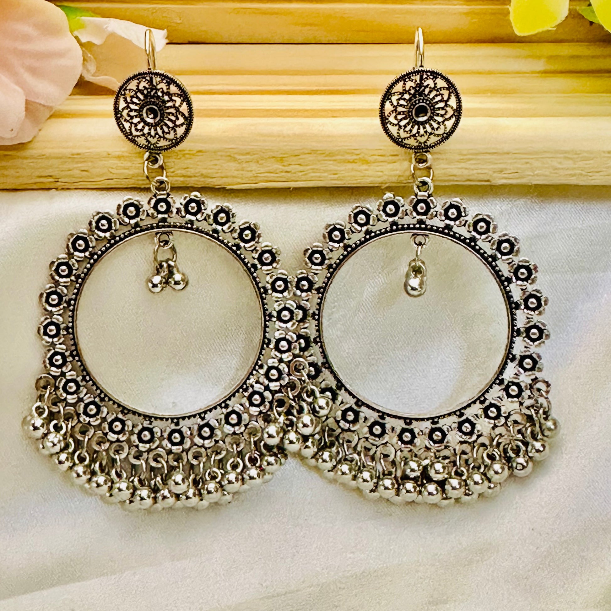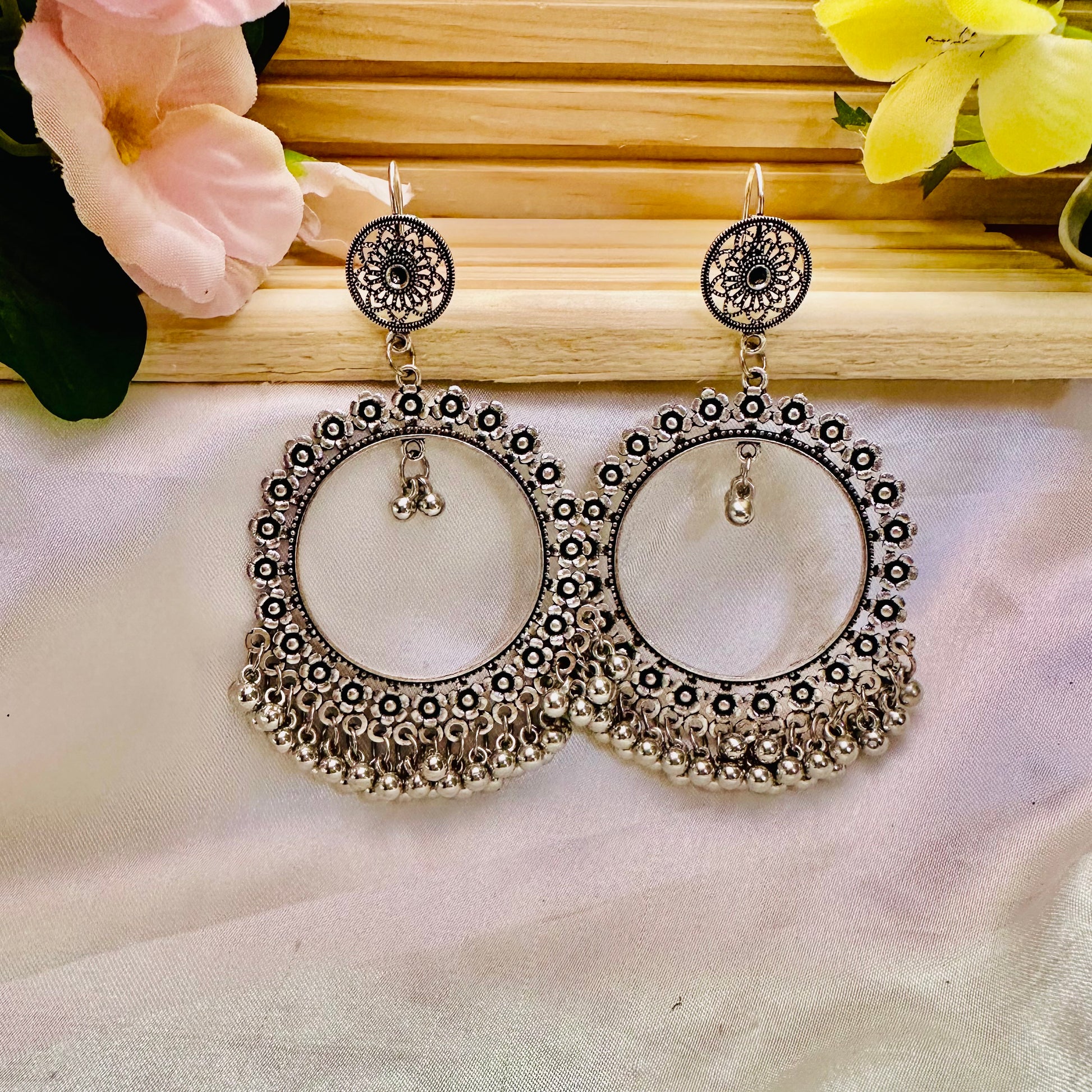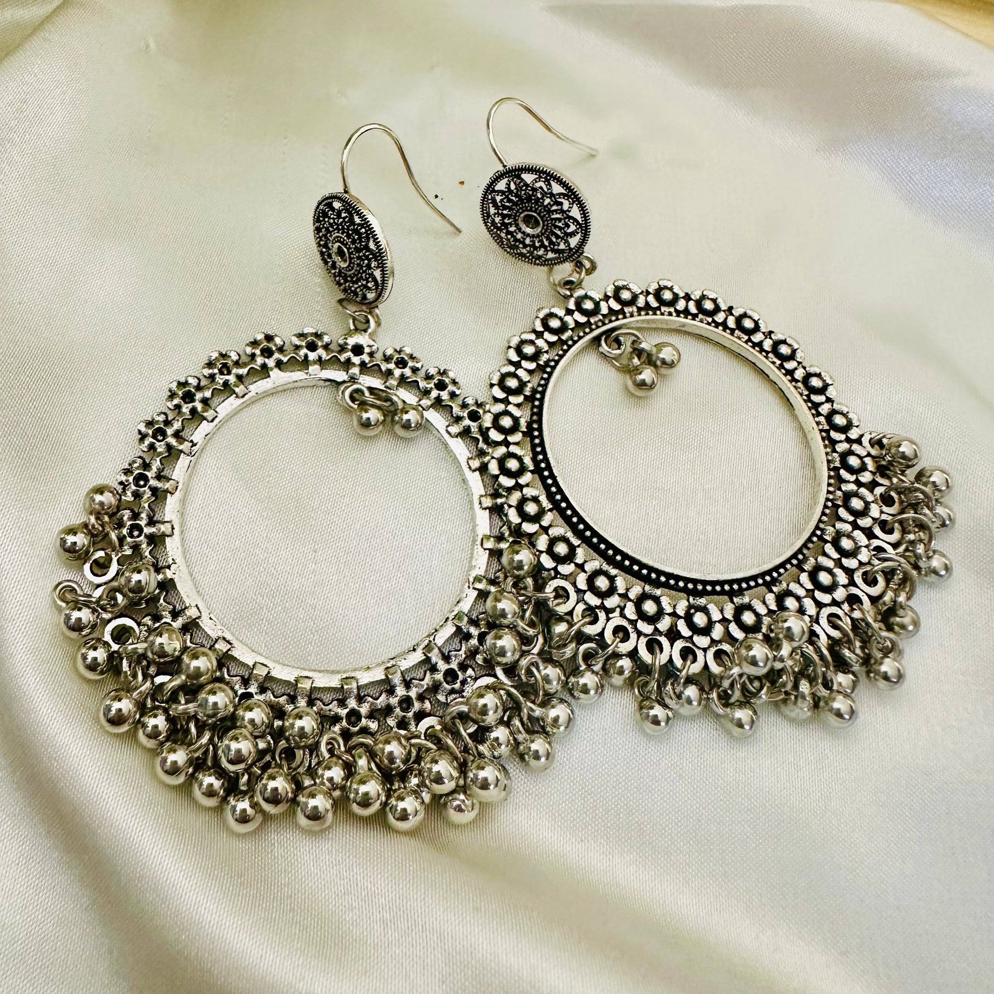 Timeless elegance meets playful charm with these stunning silver Chand bali earrings. Crafted in antique silver with an intricate circular design, each piece features delicate hanging pearls that dance with every movement. Perfect for adding a touch of traditional glamour to any occasion, these beauties blend heritage craftsmanship with contemporary flair. A versatile treasure that transforms both casual and formal looks into something truly special.