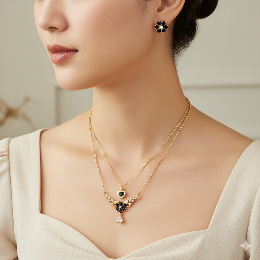 Introducing Noir Charm - the ultimate accessory for any fashion-forward individual. This stunning set features a double pendant and matching earrings in a sleek black flower design. Elevate any outfit with its elegant and versatile style. Strike a balance between power and grace with this must-have addition to your collection.