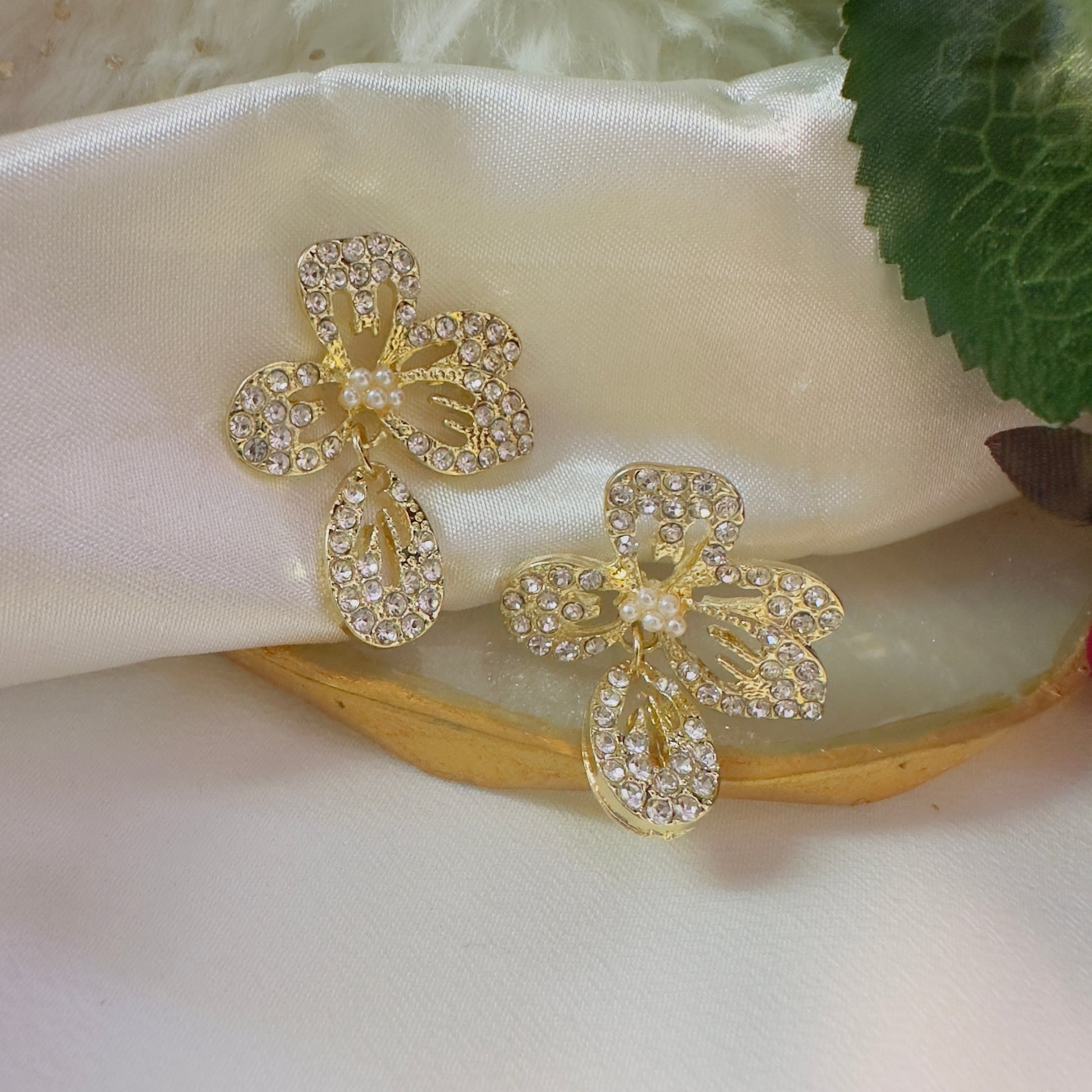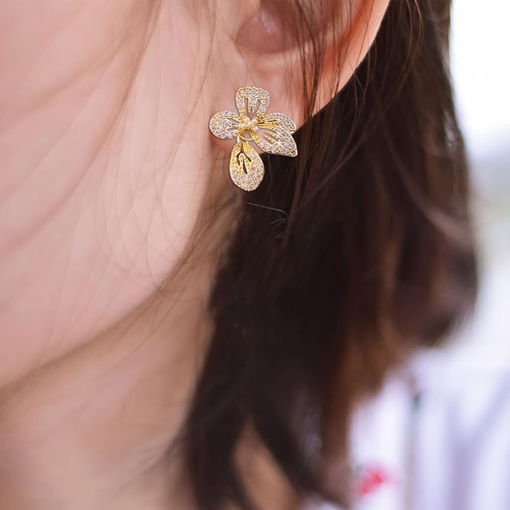 Elevate your style with Flora Dazzle earrings. These flower-shaped earrings feature a stunning white pearl center and sparkling zircons set in gold. Perfect for any occasion, feel confident and elegant with these unique and sophisticated earrings.