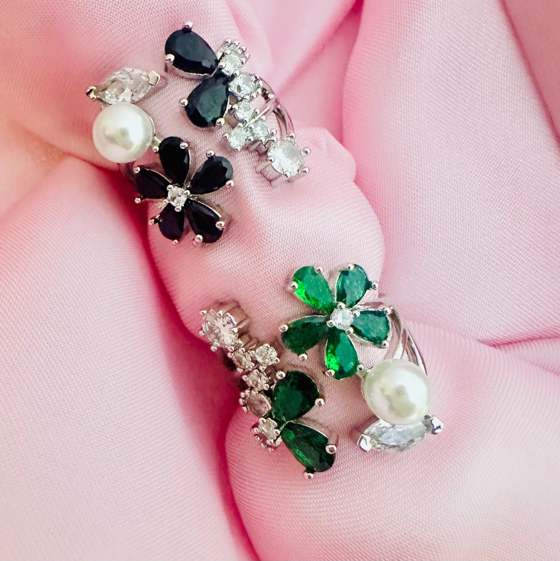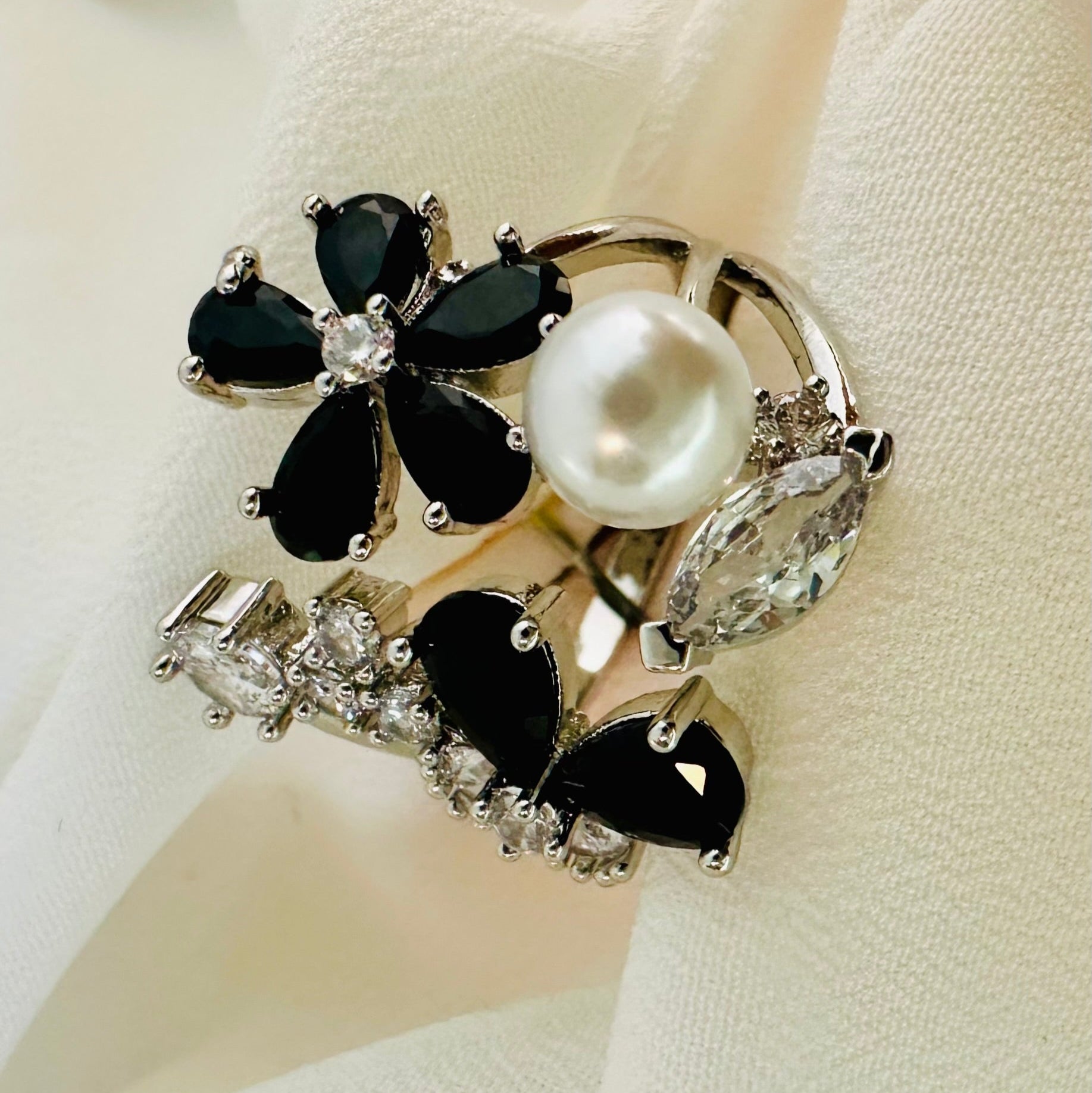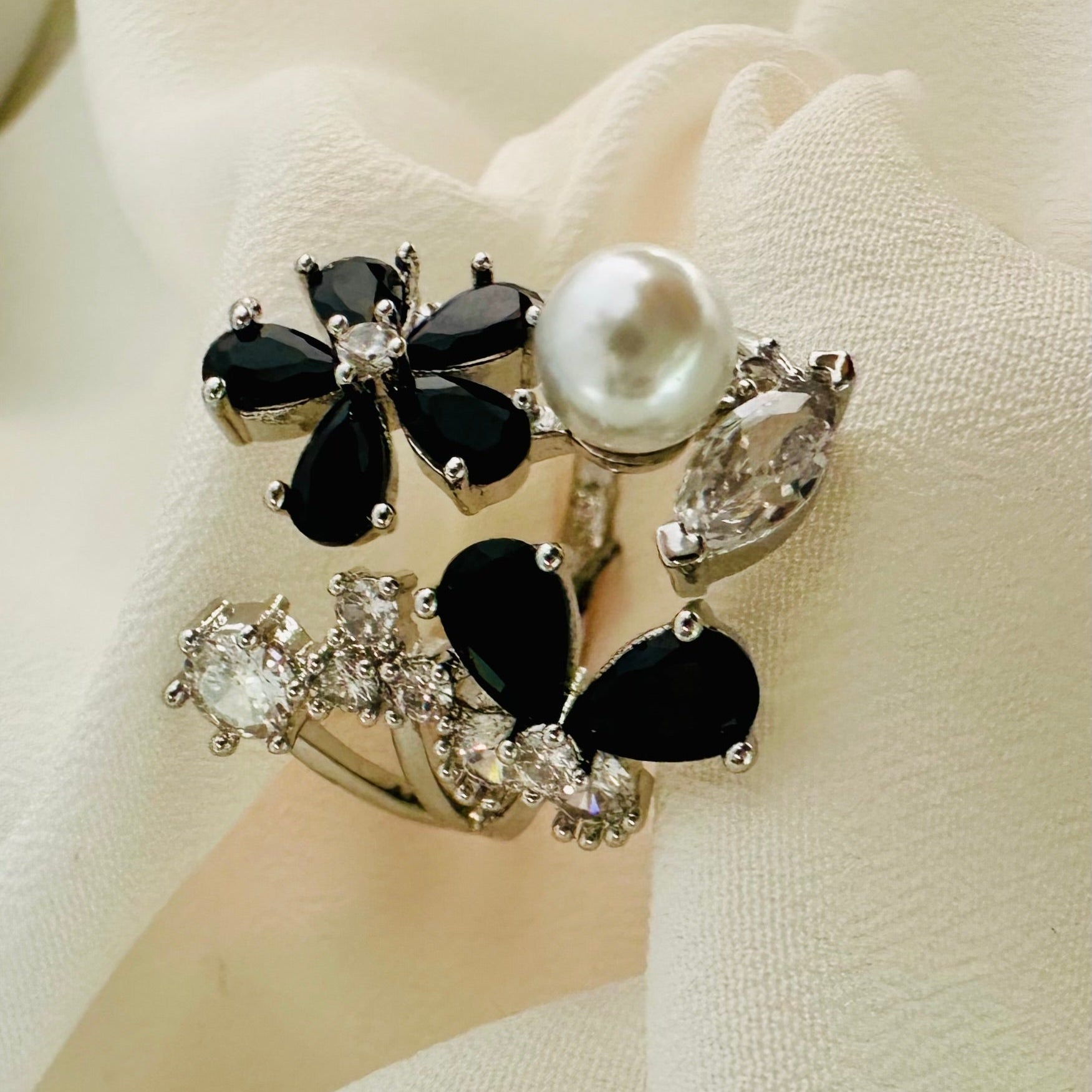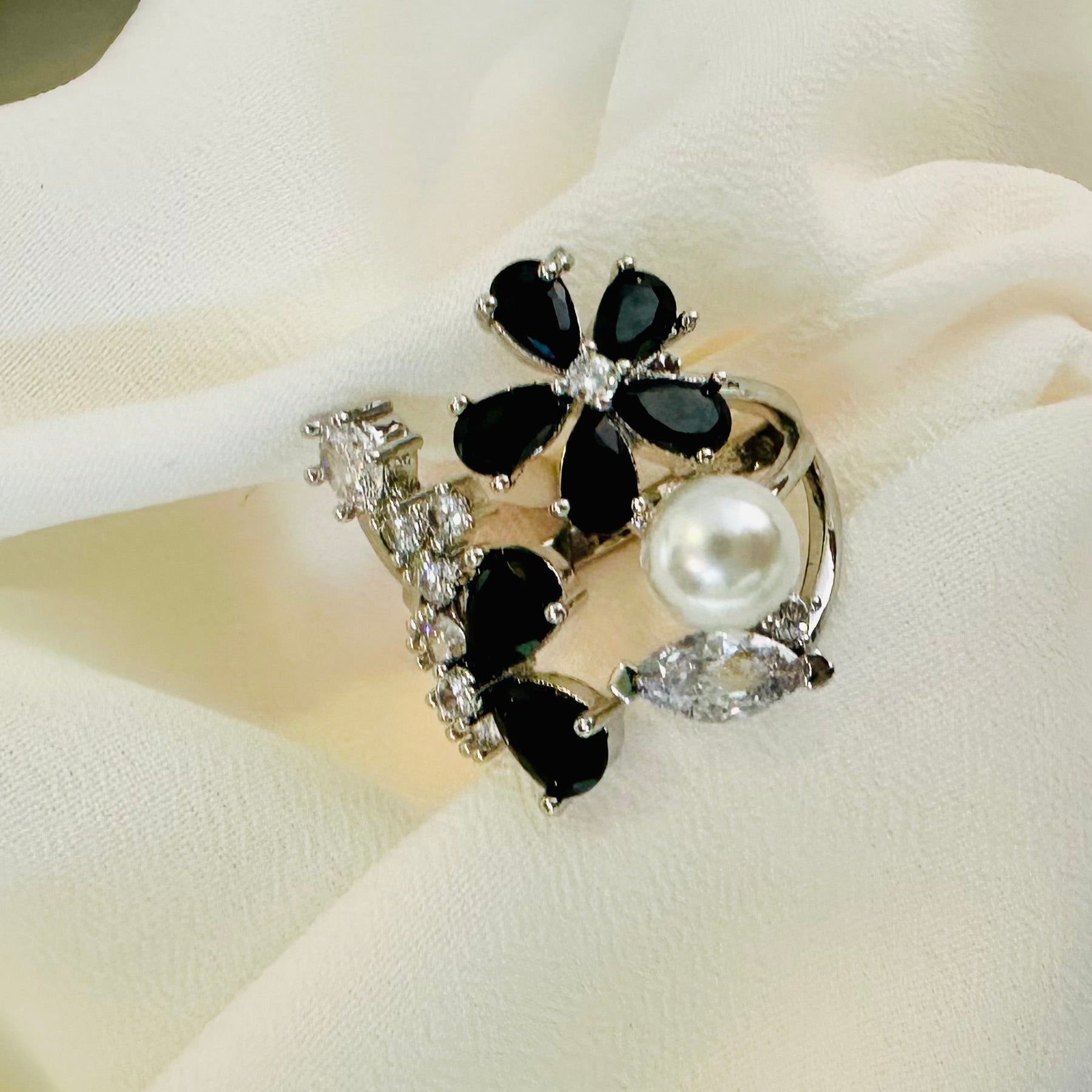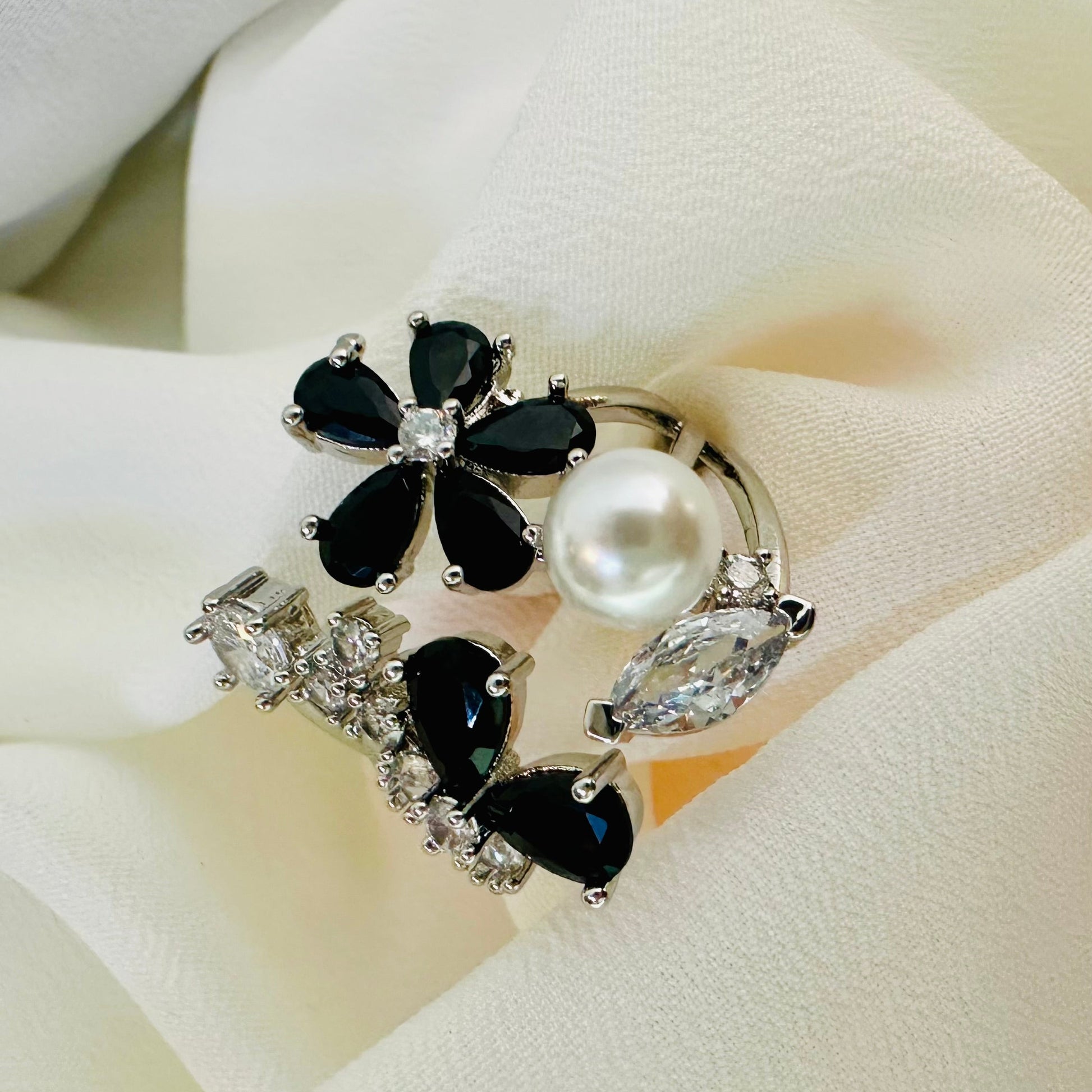 This 1-carat gold ring features an exquisite design combining delicate black floral motifs with lustrous pearls. Expertly crafted, it offers a harmonious blend of natural elegance and classic luxury, making it a sophisticated statement piece for any collection. The contrast between the vibrant black flowers and creamy pearls creates a timeless accessory that elevates both formal and everyday looks.