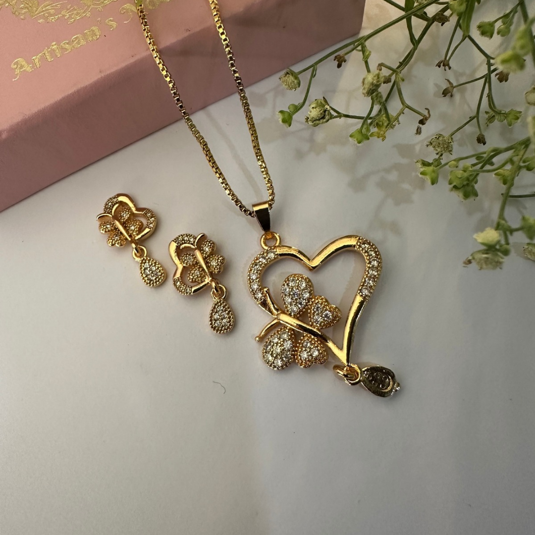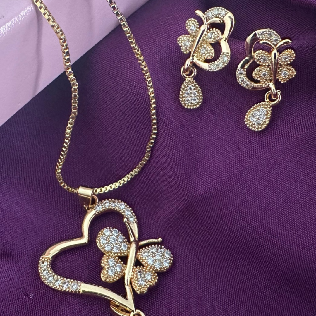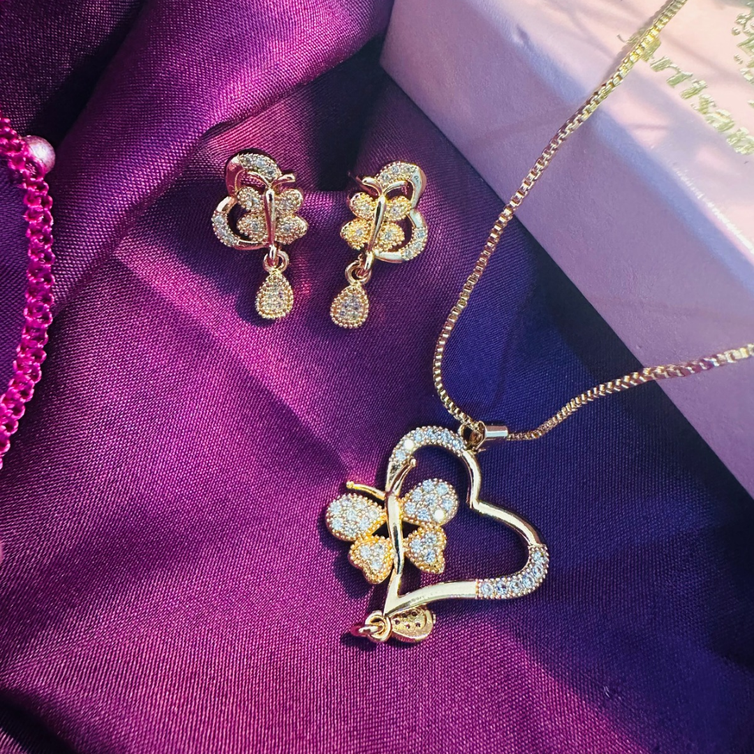 Adorn yourself with the Amour Flutter featuring a delicate butterfly pendant set in rich gold hues. The perfect accessory to add a touch of whimsy to any outfit