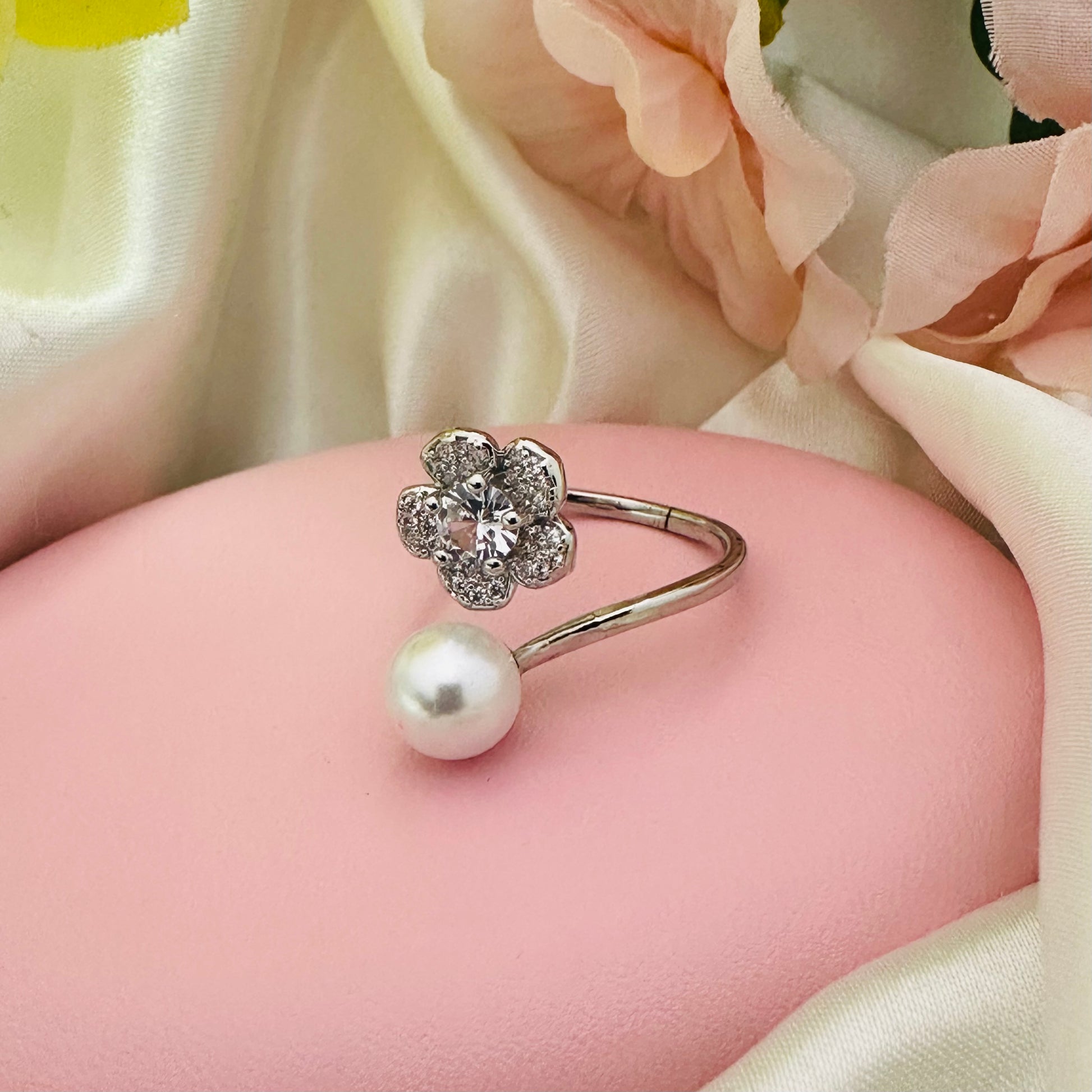 This stunning Fleure ring combines elegance with delicate flower and pearl details. The adjustable design allows for a perfect fit every time. Showcase your sophisticated style with this unique and timeless piece.