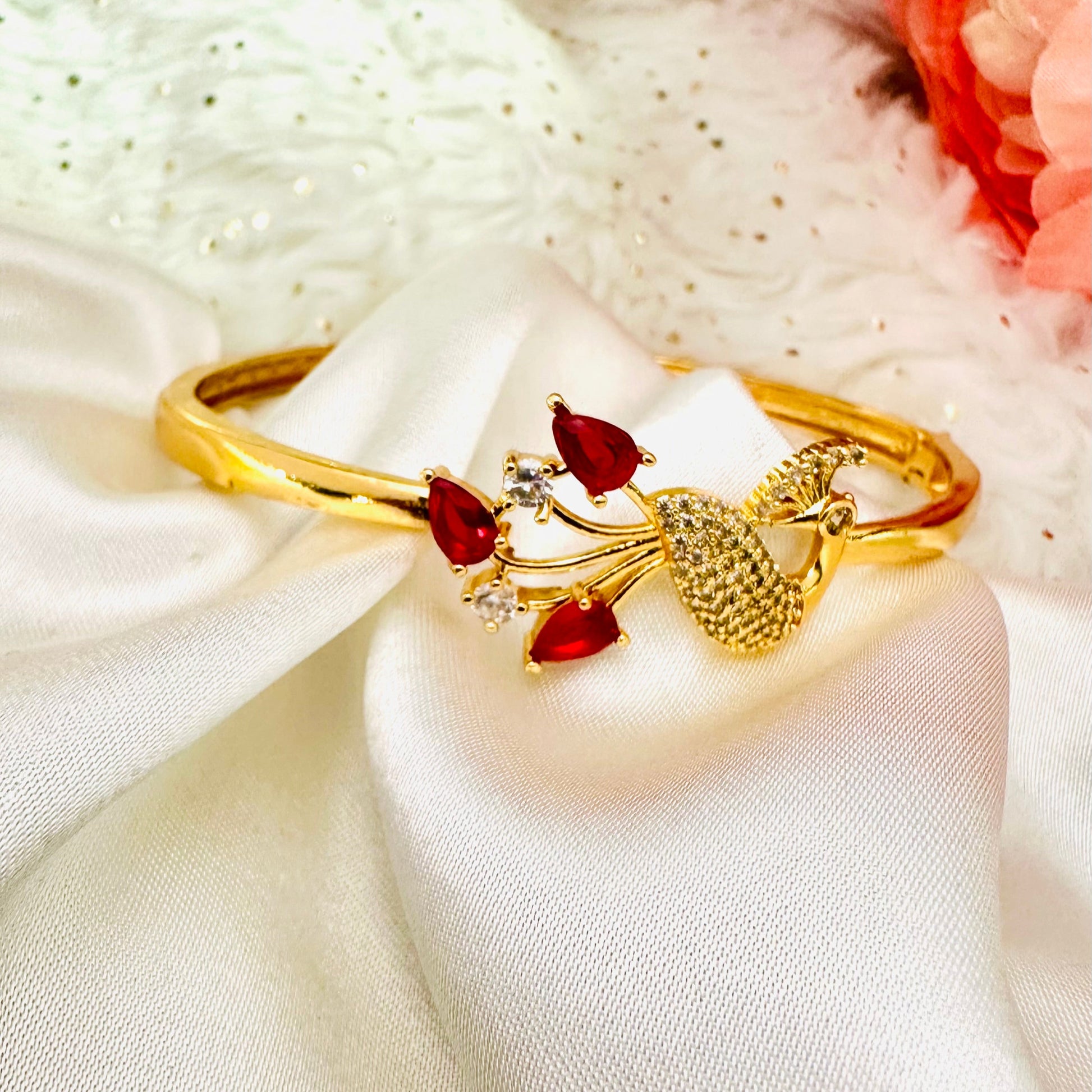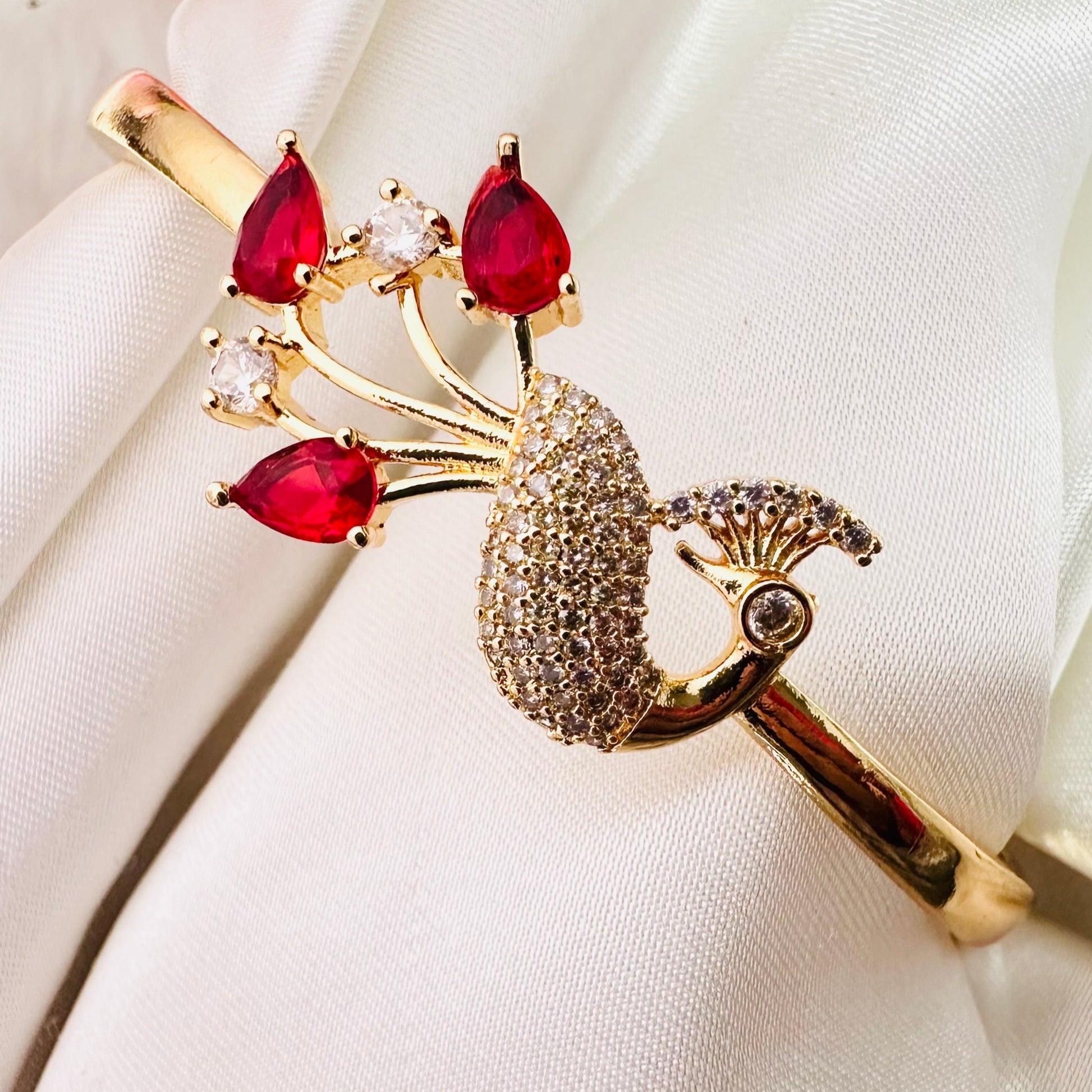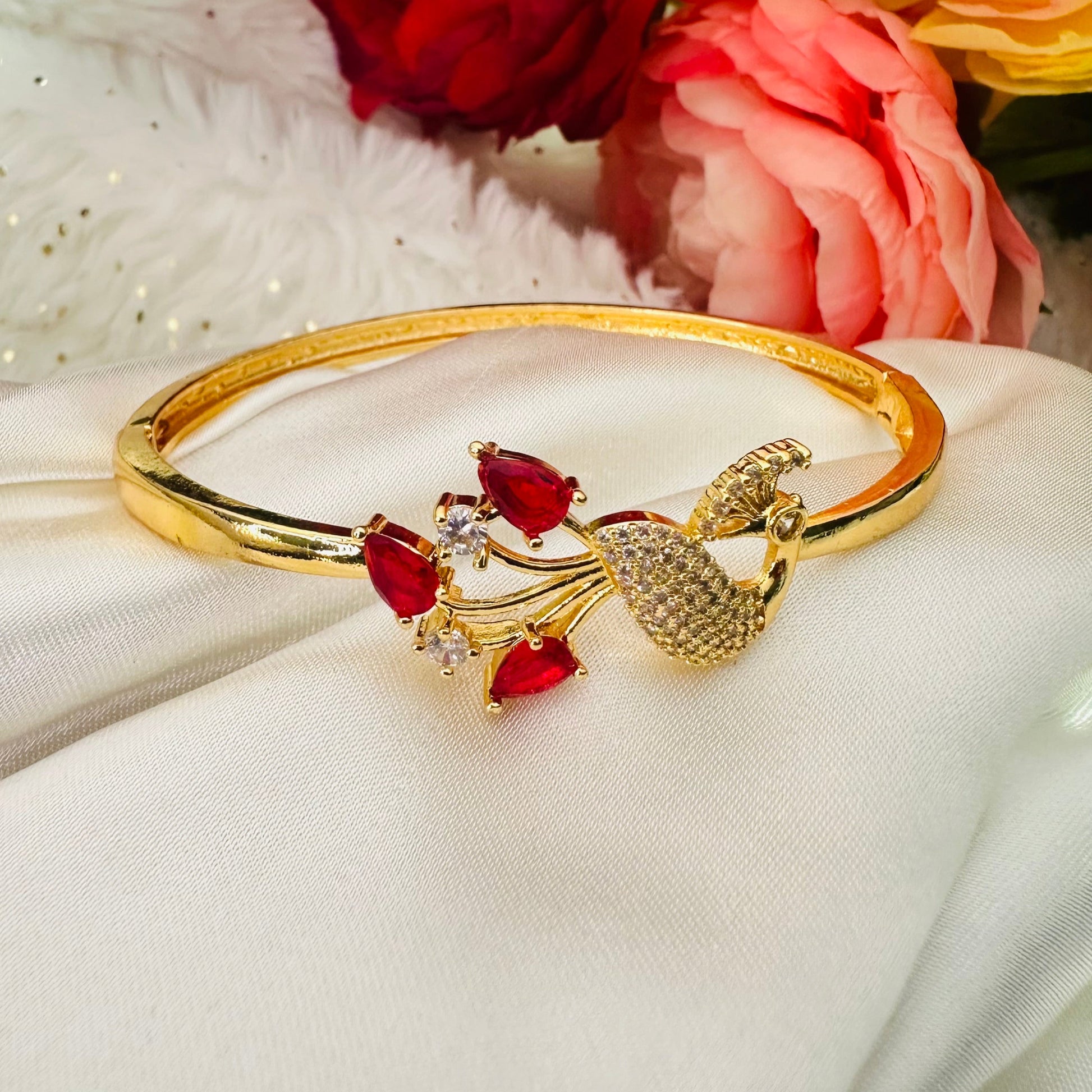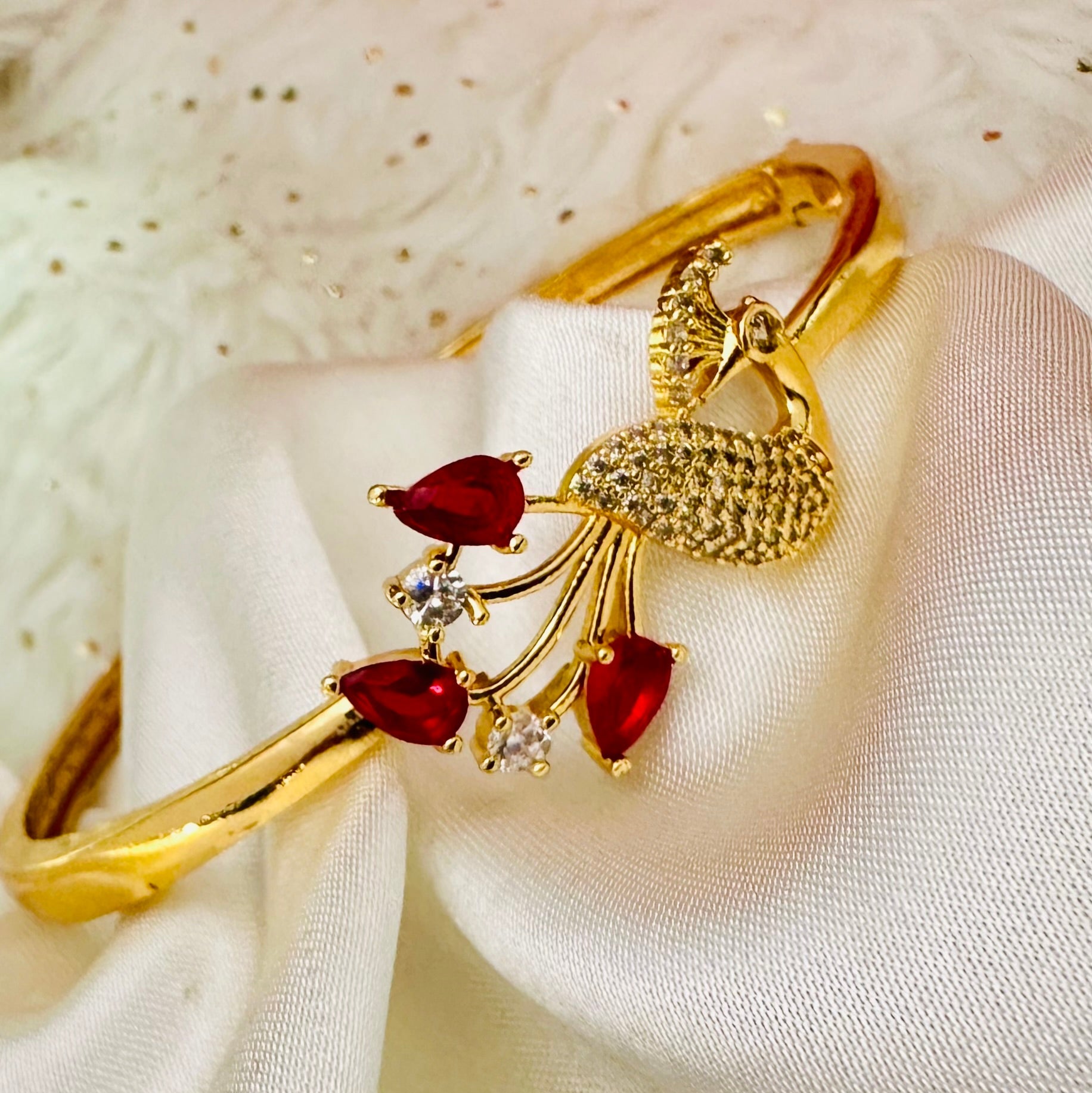 This elegant cuff bracelet features a delicate design with a graceful peacock adorned by striking red stones. Its refined craftsmanship offers a sophisticated accessory that enhances any ensemble with a subtle yet memorable touch of color and elegance. Ideal for those who appreciate expert artistry and timeless style.