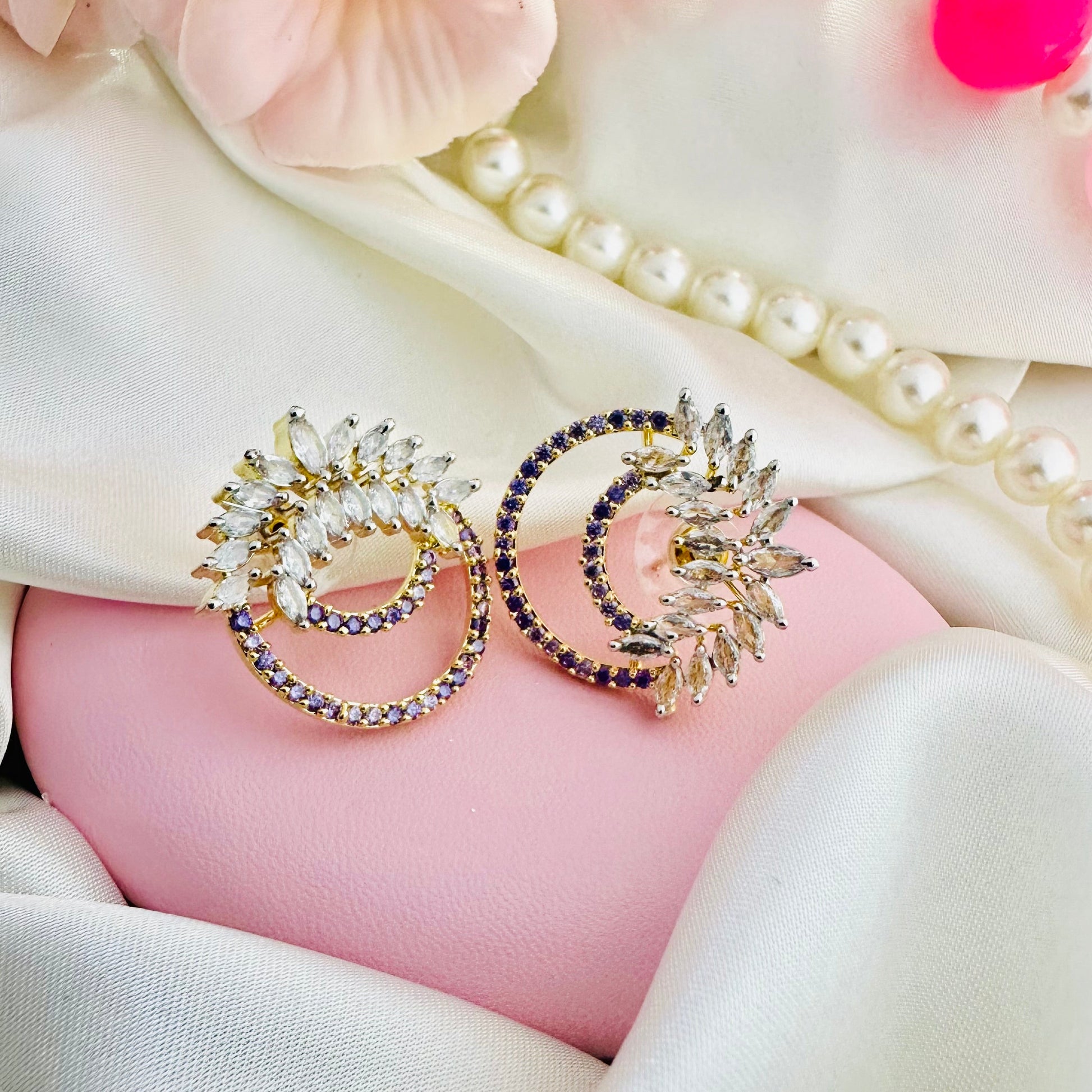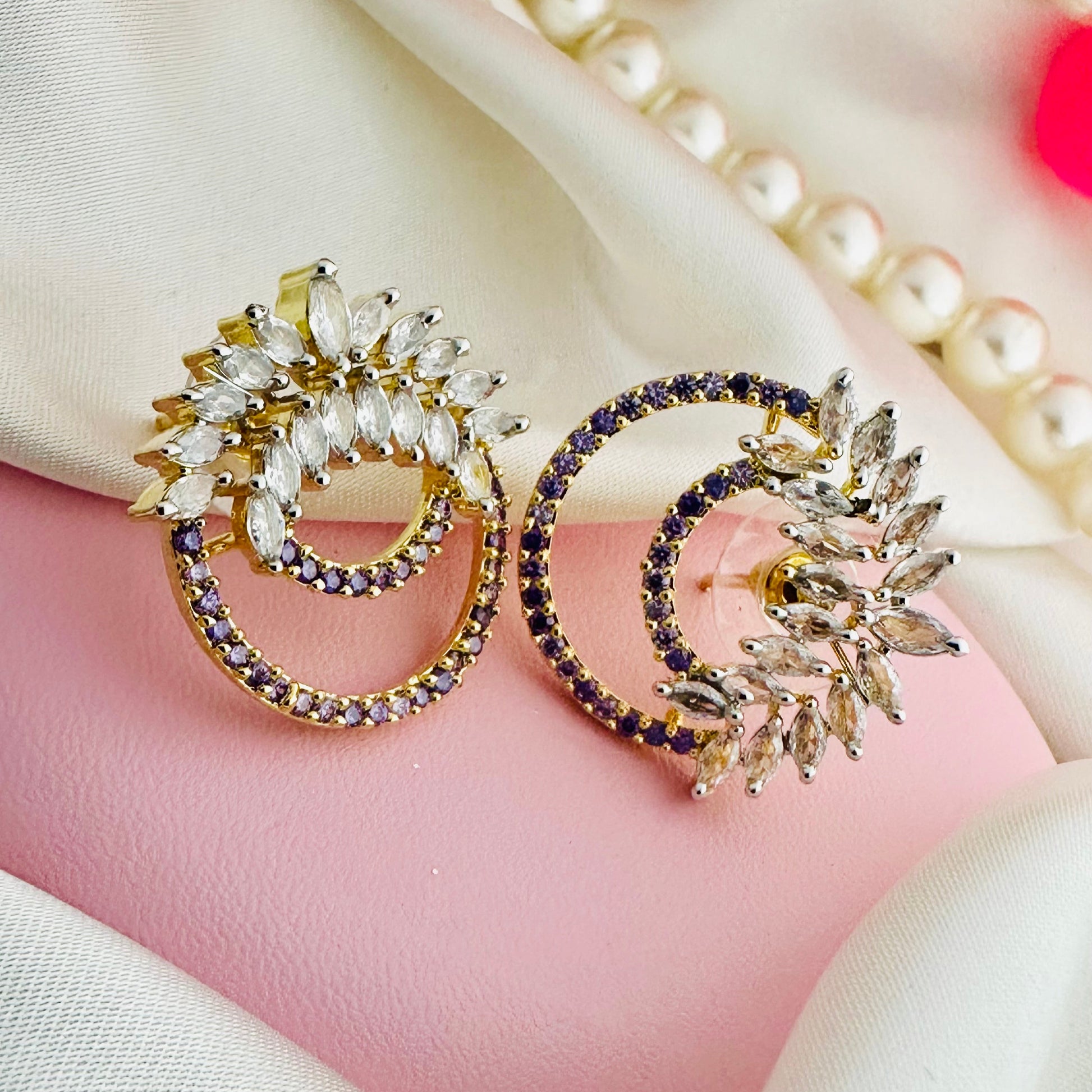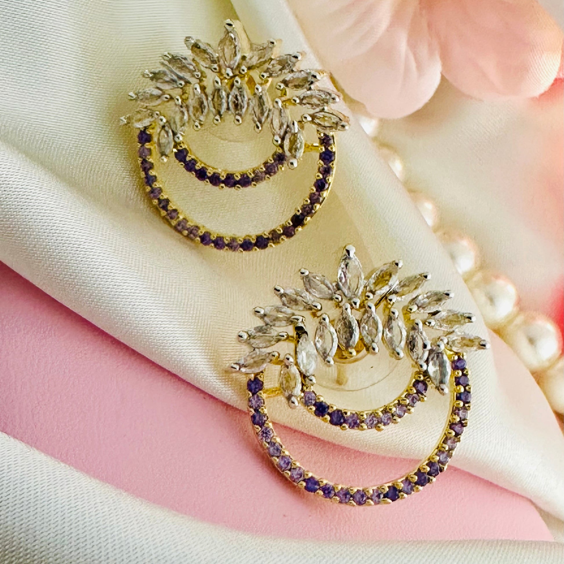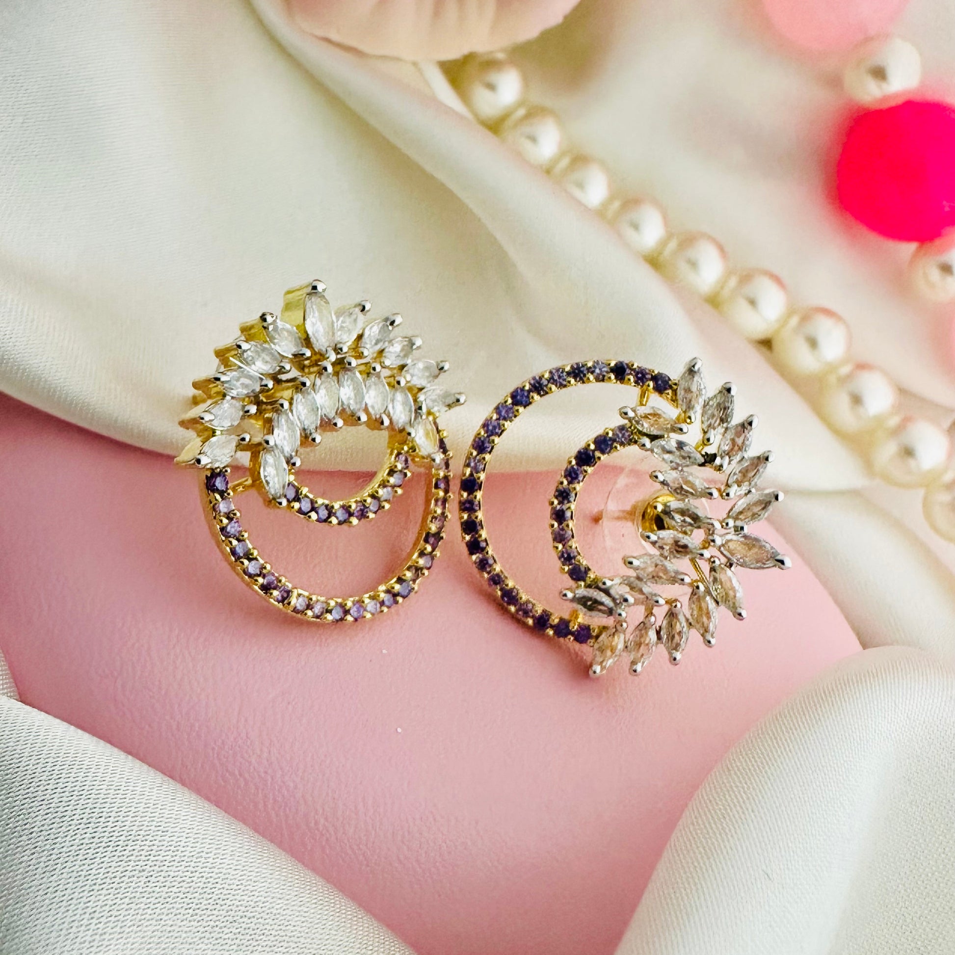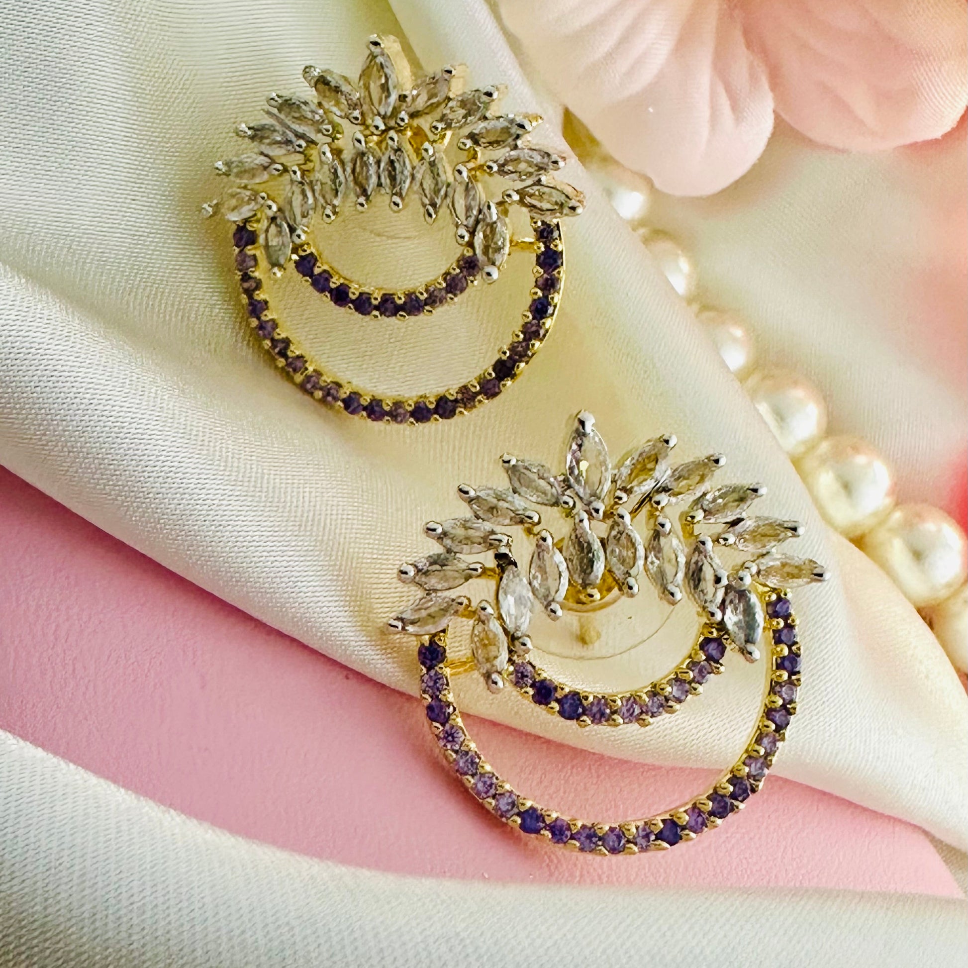 Elevate your look with Ivy Crescent earrings in mauve. Featuring a double arc of sparkling zircons and ivy-shaped stones, these 1 carat gold studs add a touch of elegance to any outfit. Experience the luxury of high-quality stones and expert craftsmanship.