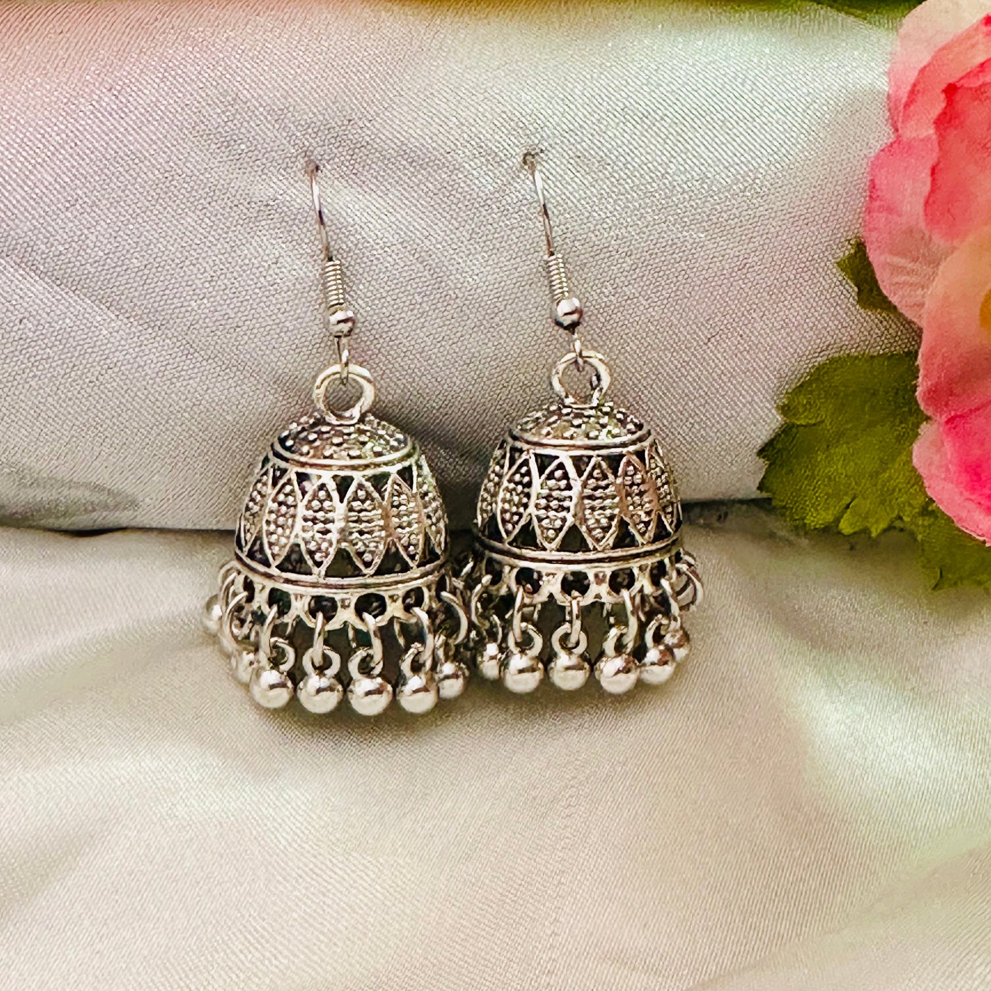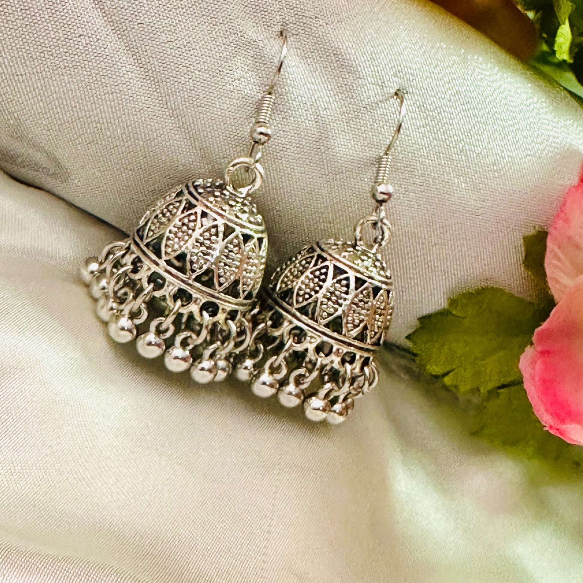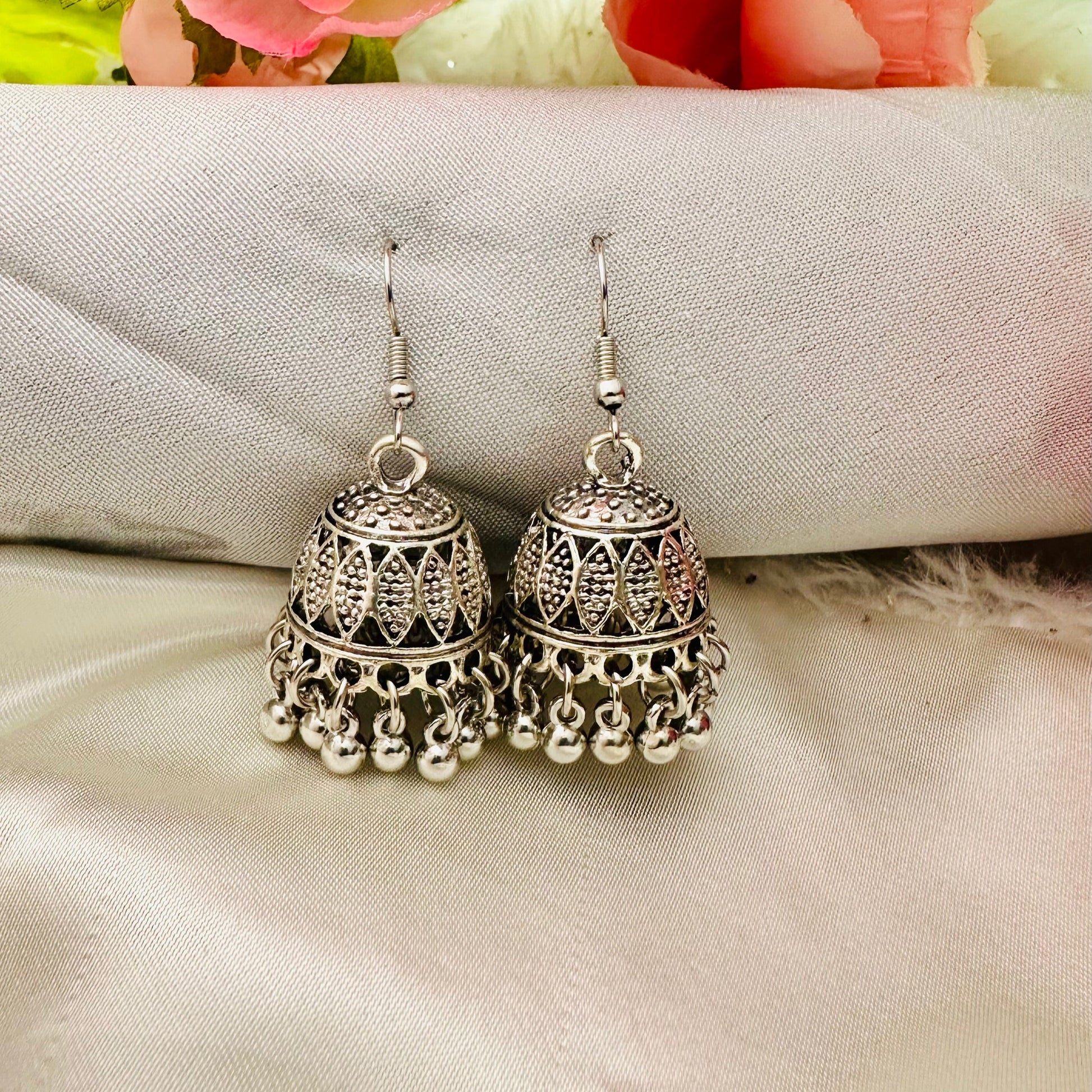 Add a playful sparkle to your look with these cute, stylish silver jhumkas. Perfect for any occasion, they effortlessly combine traditional charm with a modern twist, making them your go-to accessory for instant glam and fun. Lightweight and beautifully crafted, these jhumkas are designed to keep you comfortable while turning heads wherever you go.