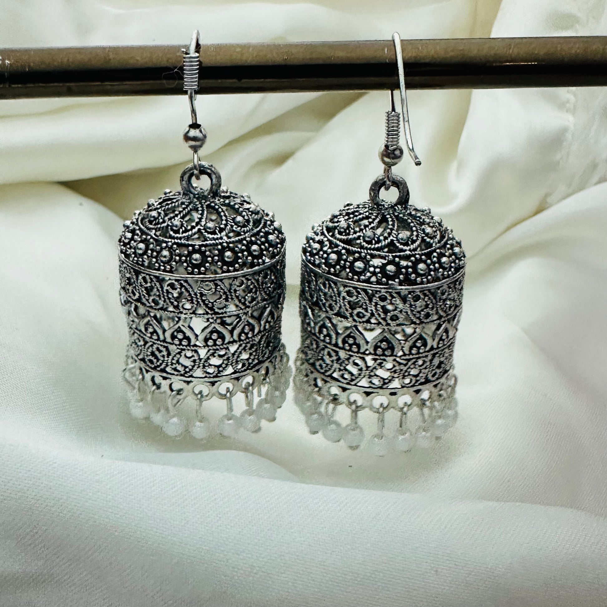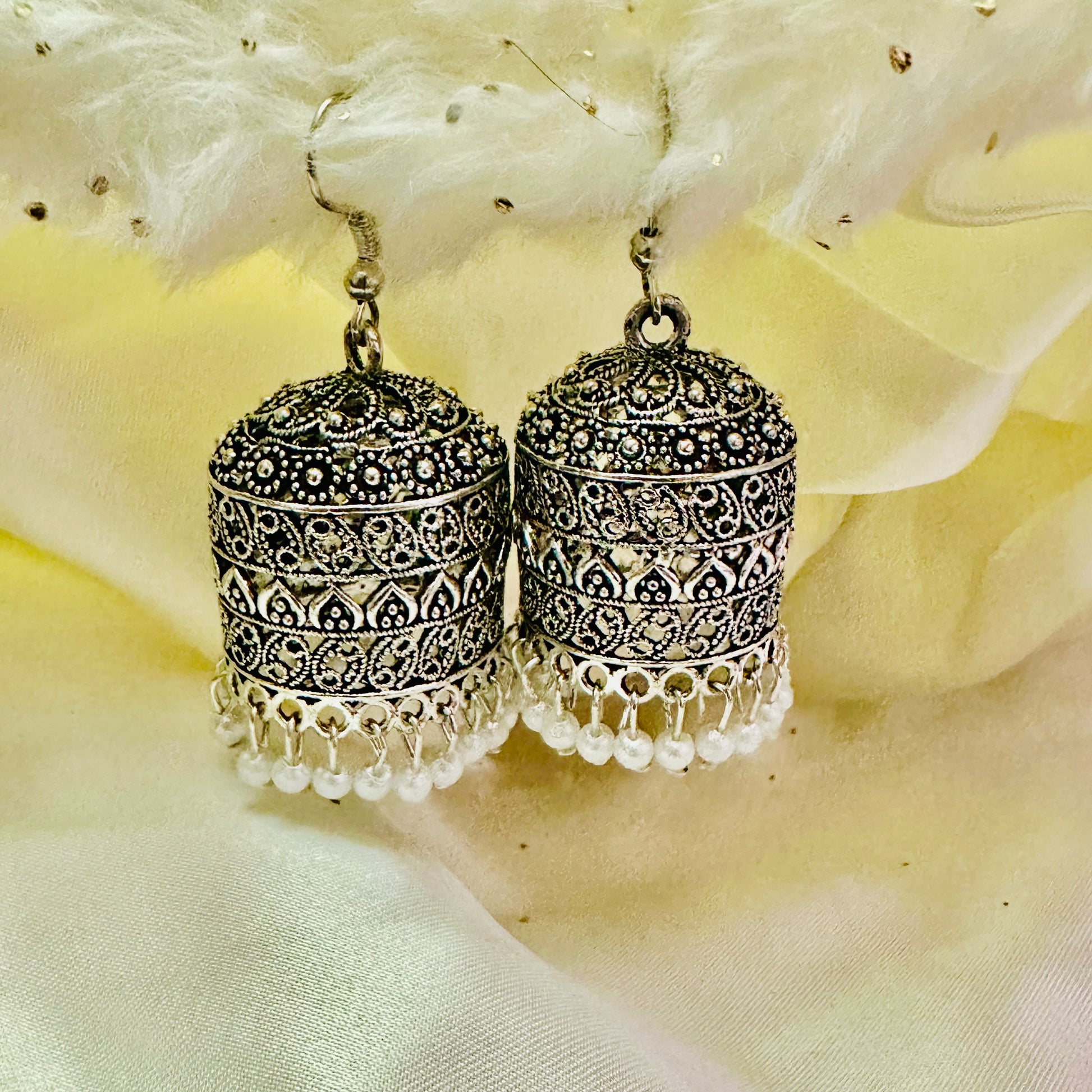 Introducing Silver Bells - exquisite jhumkas, crafted with intricate details in silver. Elevate any outfit with these timeless pieces, perfect for any occasion. Guaranteed to add a touch of elegance and sophistication to your style.