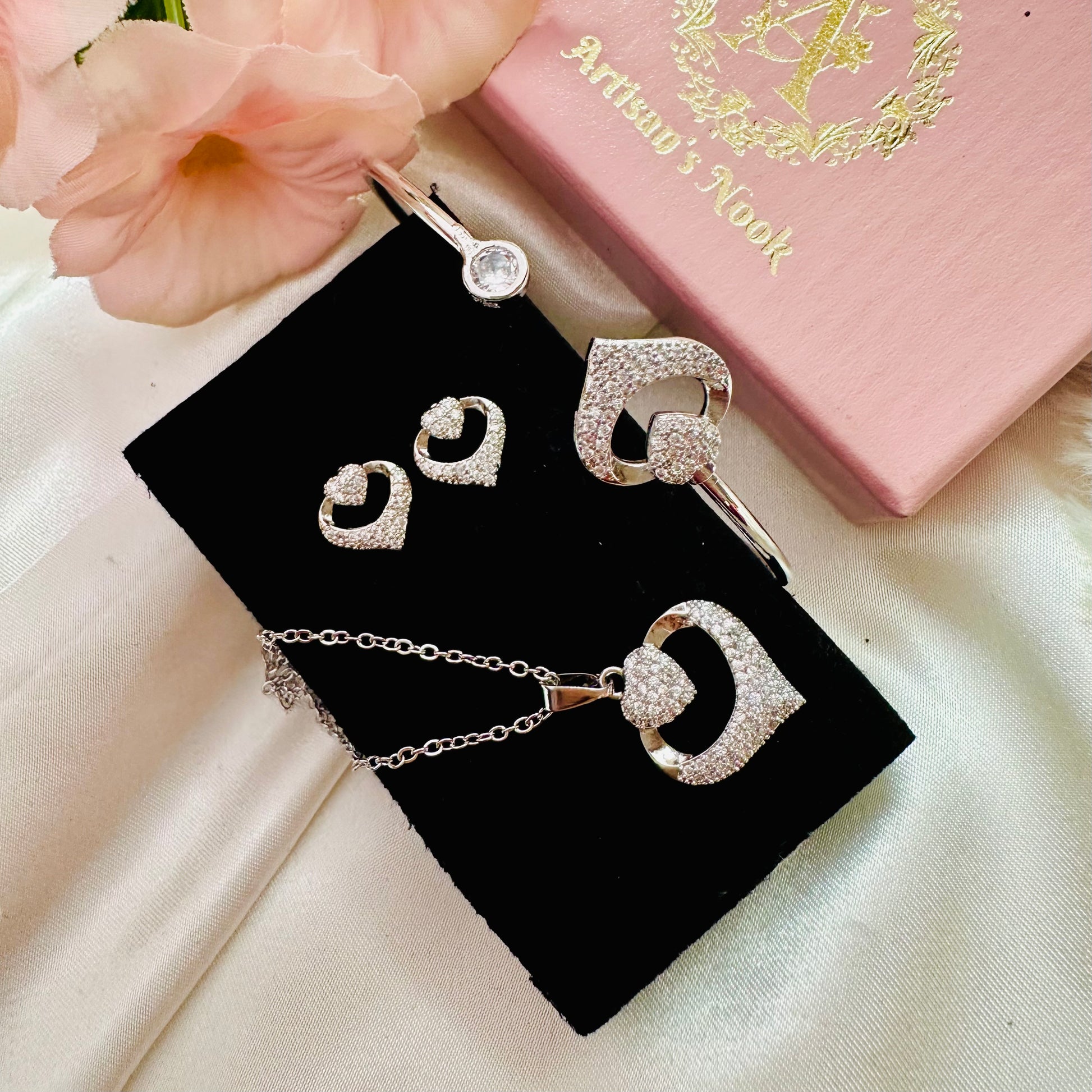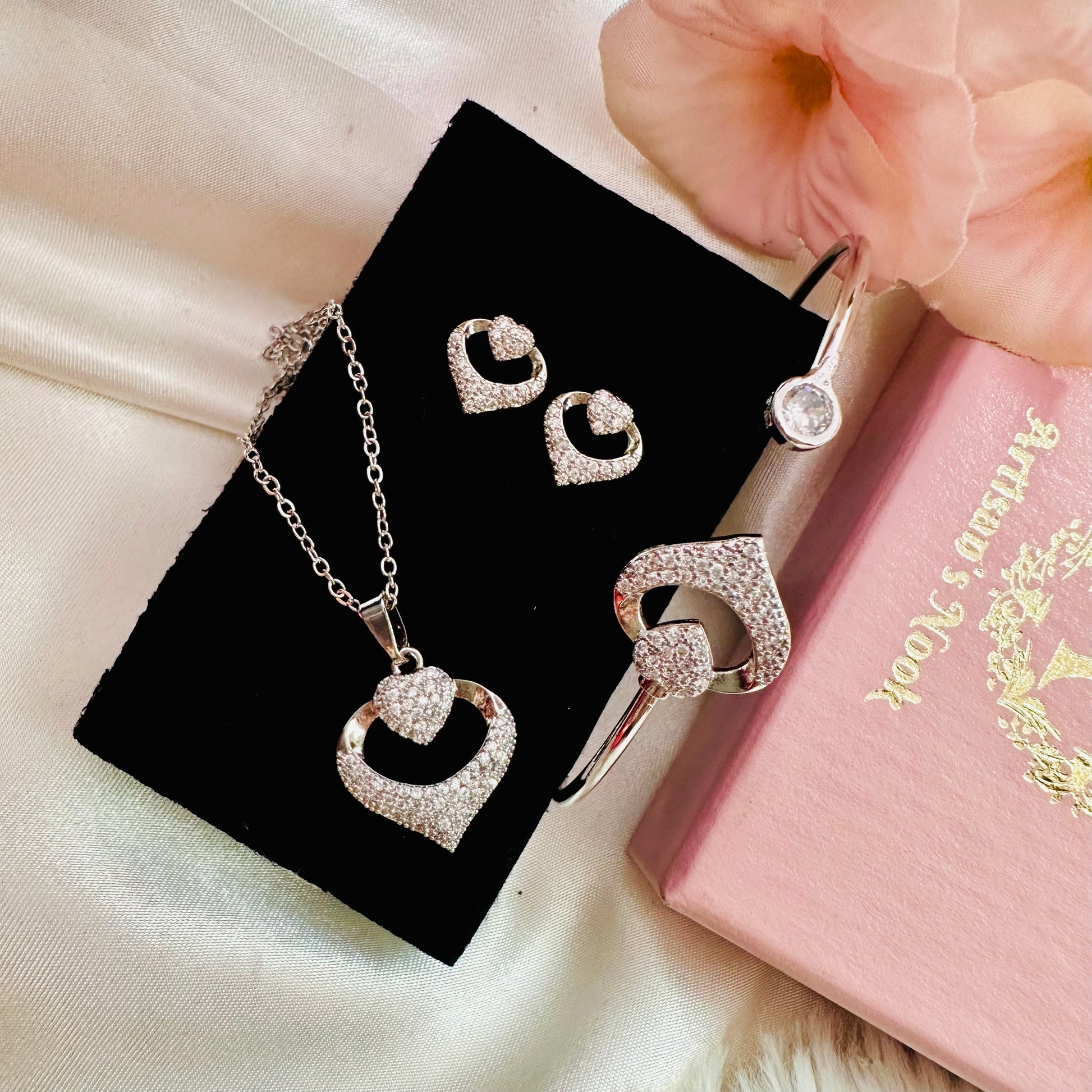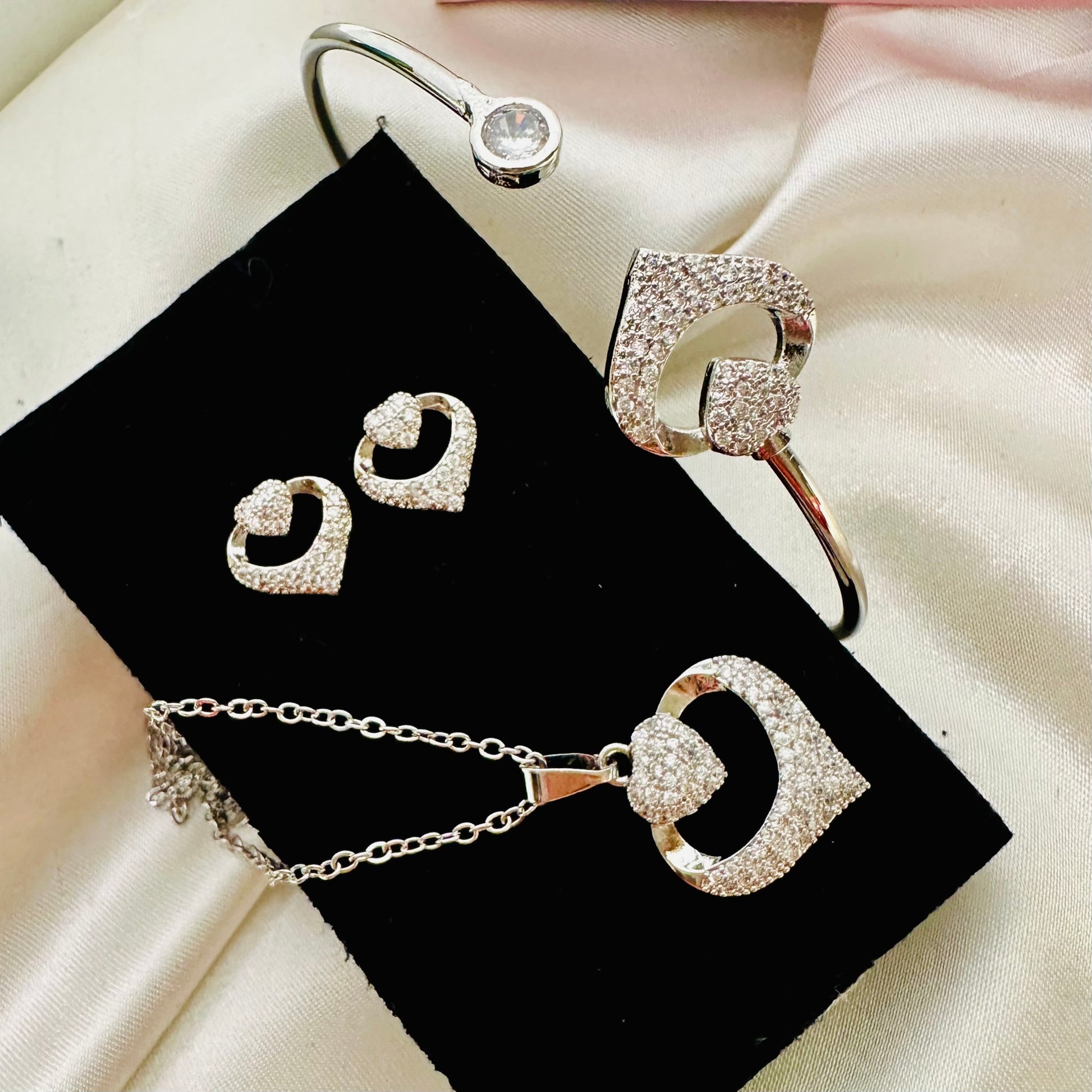 A silver heart crowned with sparkling zircons meets an adjustable cuff bracelet—the perfect pairing for romance with a modern edge. This set lets you layer love across your wrist and chest, mixing metals and shine in a way that feels effortlessly chic. The adjustable bracelet fits your way, while the pendant adds that extra sparkle that catches every glance. Sweet, versatile, and just the right amount of glamour for any moment.
