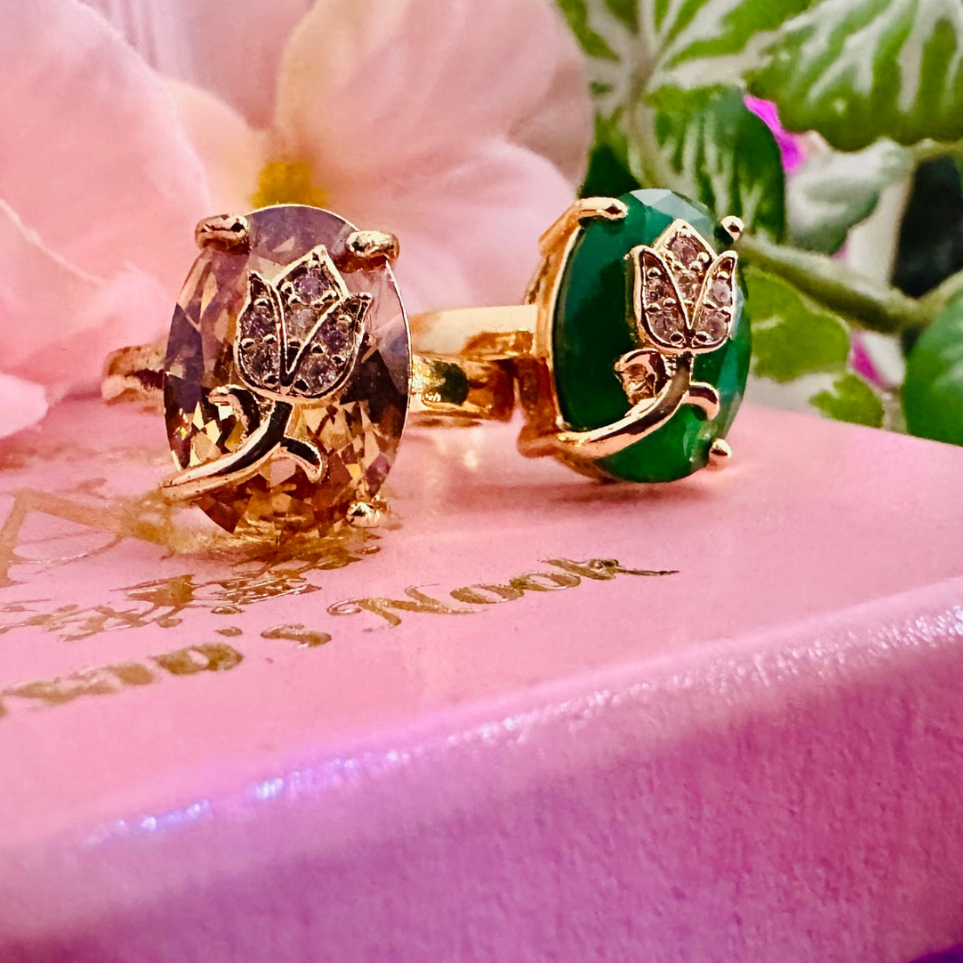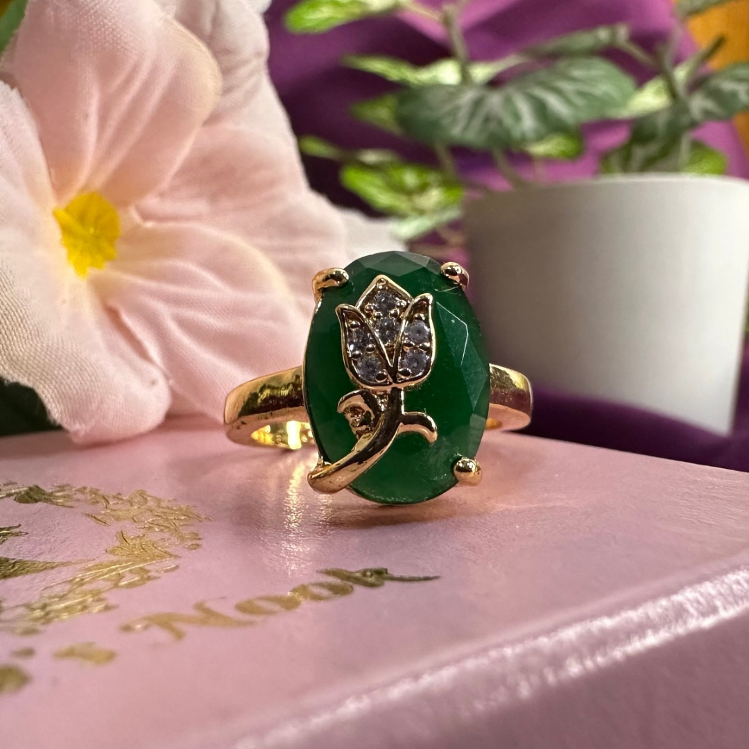This solitaire ring features an elegant oval green stone, complemented by a delicate tulip engraving that adds a unique artistic touch. Expertly crafted, the design balances classic sophistication with subtle floral detail, making it an exceptional piece for those who appreciate refined jewelry with a meaningful motif. The rich green hue enhances the ring's timeless appeal.
